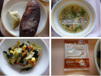 ココアあげパン、牛乳、かきたまスープ、ビックぎょうざ、海藻サラダ、ミルメークキャラメル
