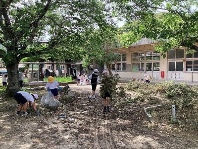 そのメイン会場となる旧吉部小学校中庭の清掃を行いました。地域の方が刈ってくださっていた草や落ち葉を集めたり、剪定された木の枝を運んだりしました。