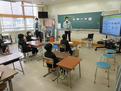 今日は宇部市廃棄物処理課から4名の講師(西田さん、厚東さん、小山さん、冨嶋さん)をお招きし、本校で取り組んだ段ボールコンポストで、生ごみをたい肥にしたことで、ごみをどれくらい減らすことができたのかを学びました。