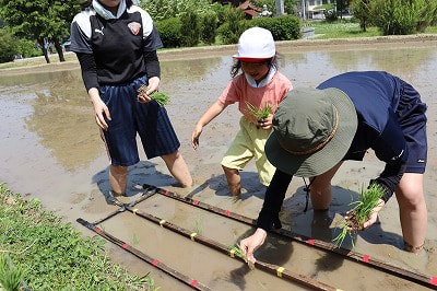 まず、畦(あぜ)から田んぼに入って一列に並び、昔懐かしい田植え道具である「田植え定規」を使って、苗を一定間隔に並ぶように植えていきました。植える時には子ども1~3人に大人(地域の方や山口大学の学生)1人が担当してくださり、スムーズに苗を植えることができました。田植えは毎年実施しているので高学年になるにつれ、植え方も上手です。