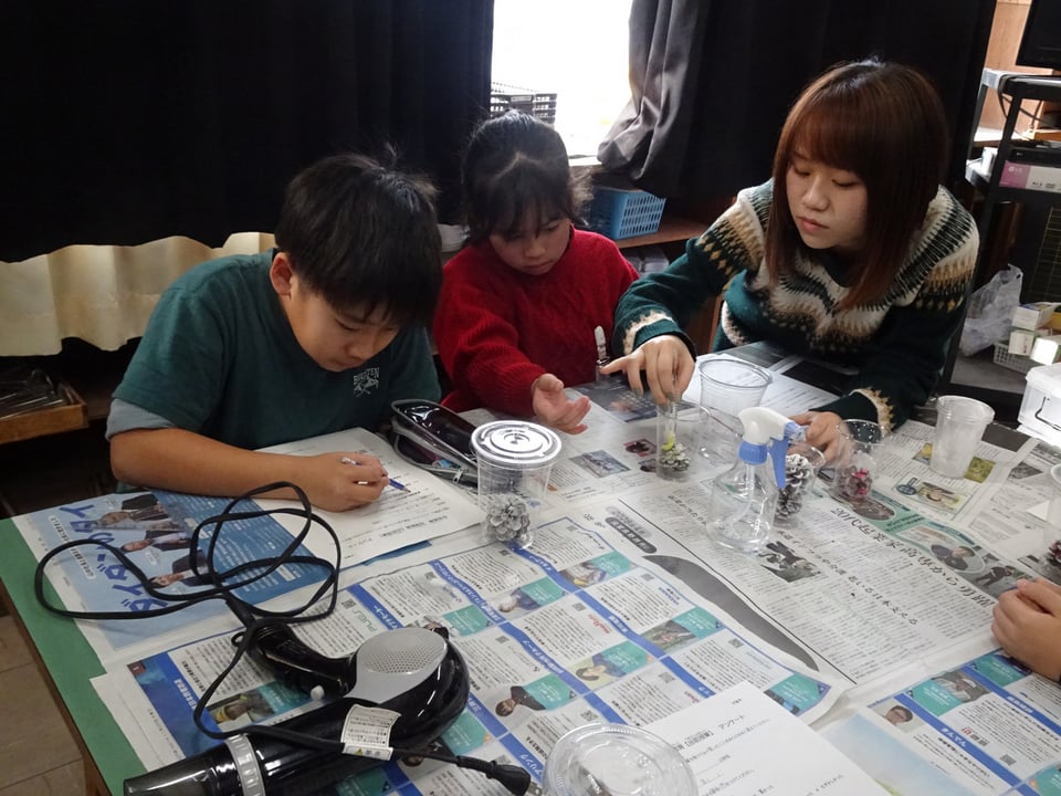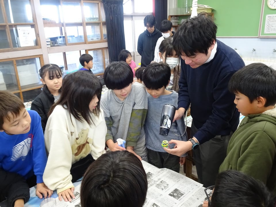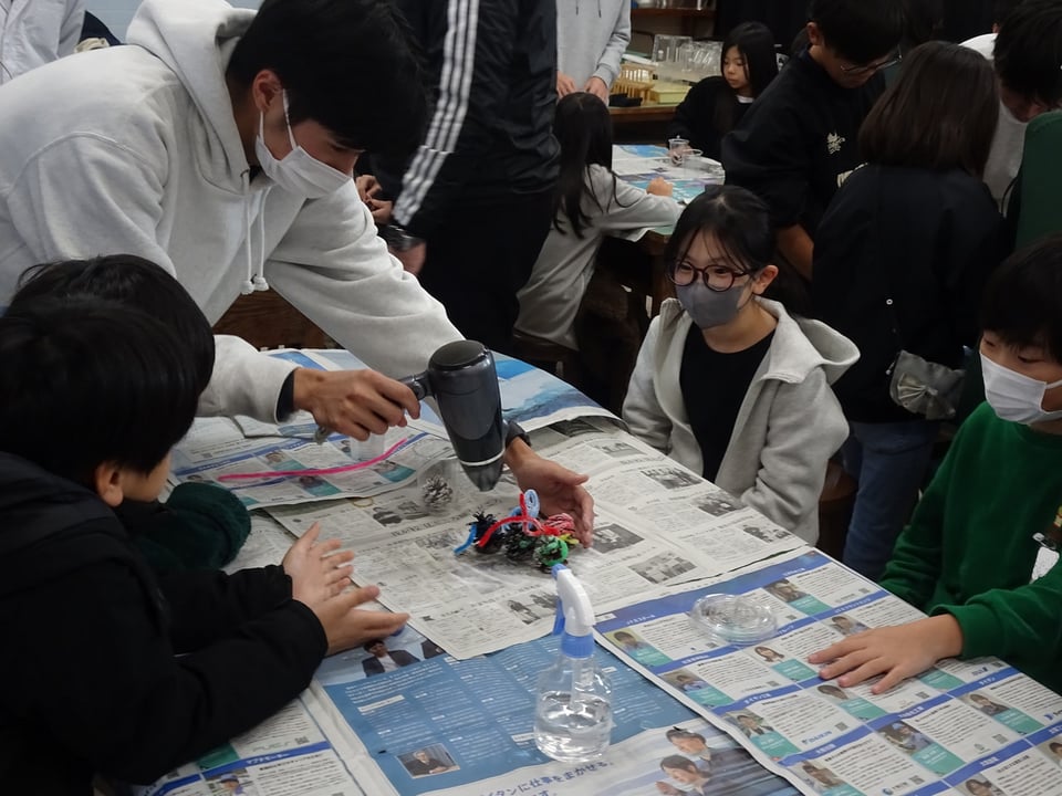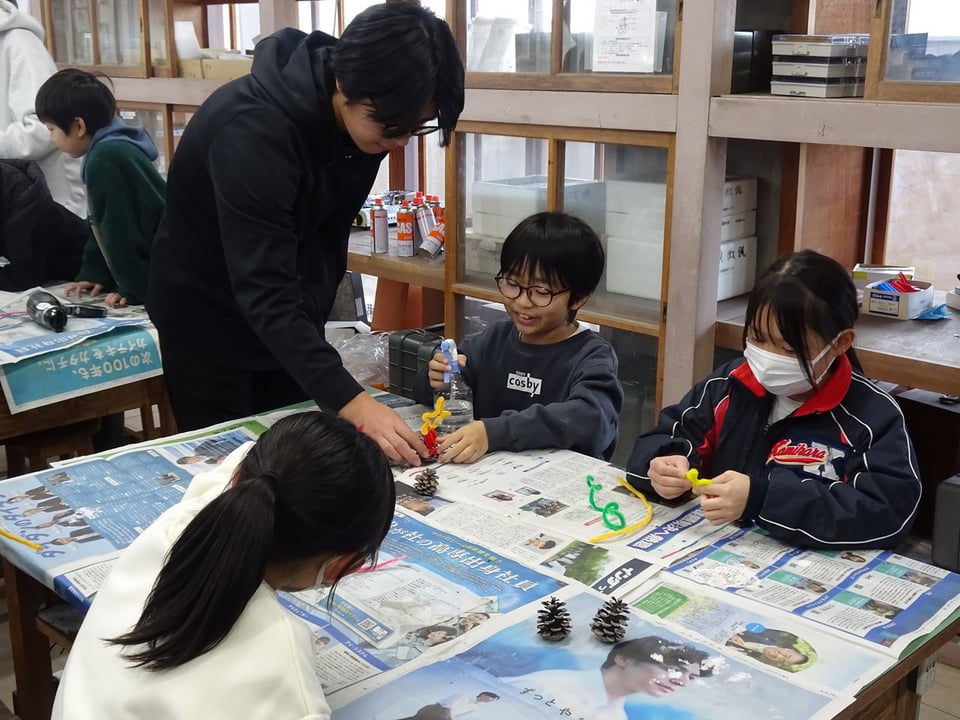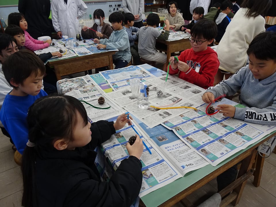 4年生が宇部高専物質工学科の皆さんによる出前授業「松ぼっくりでクリスマスツリーを作ろう!」を受けました。尿素を吹き付けた松ぼっくりやモールをドライヤーで温めると、液体の尿素が再結晶化し、雪の結晶のように白く変化します。子どもたちは何度も作業を繰り返しながら、自分だけの素敵なクリスマスツリーを作っていました。完成した作品はプラスチックカップに入れて、部屋に飾れるようにしました。宇部高専の皆さん、楽しい授業をありがとうございました。
