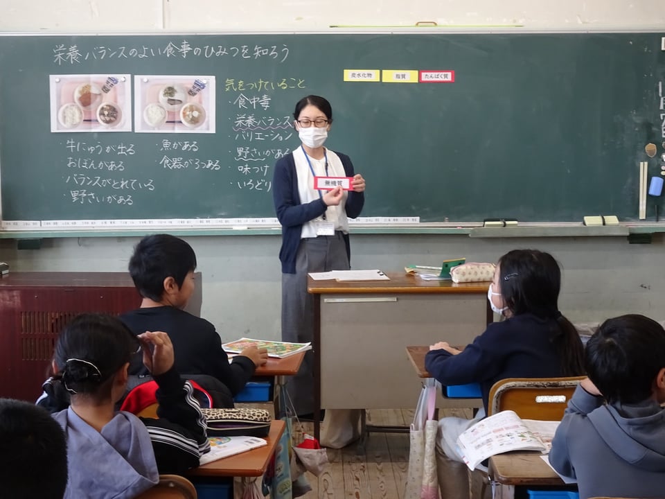 5年生の巡回栄養指導が行われ、五大栄養素について学習しました。最初に、給食の写真を見ながら、給食には様々な食品が使われていることを確認しました。次に、五大栄養素とそのはたらきについて学習し、今日の給食に使われている食材を栄養素別に分類していきました。子どもたちは、作業を通して、給食にはたくさんの食材がバランスよく使われていることに気づいていました。5年生は残食が多いようですが、今日の学習をきっかけに、栄養バランスを考えながらしっかりと食べてほしいなと思っています。