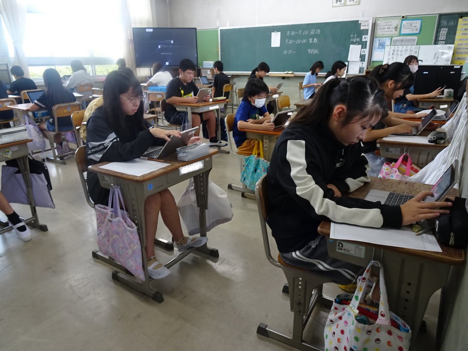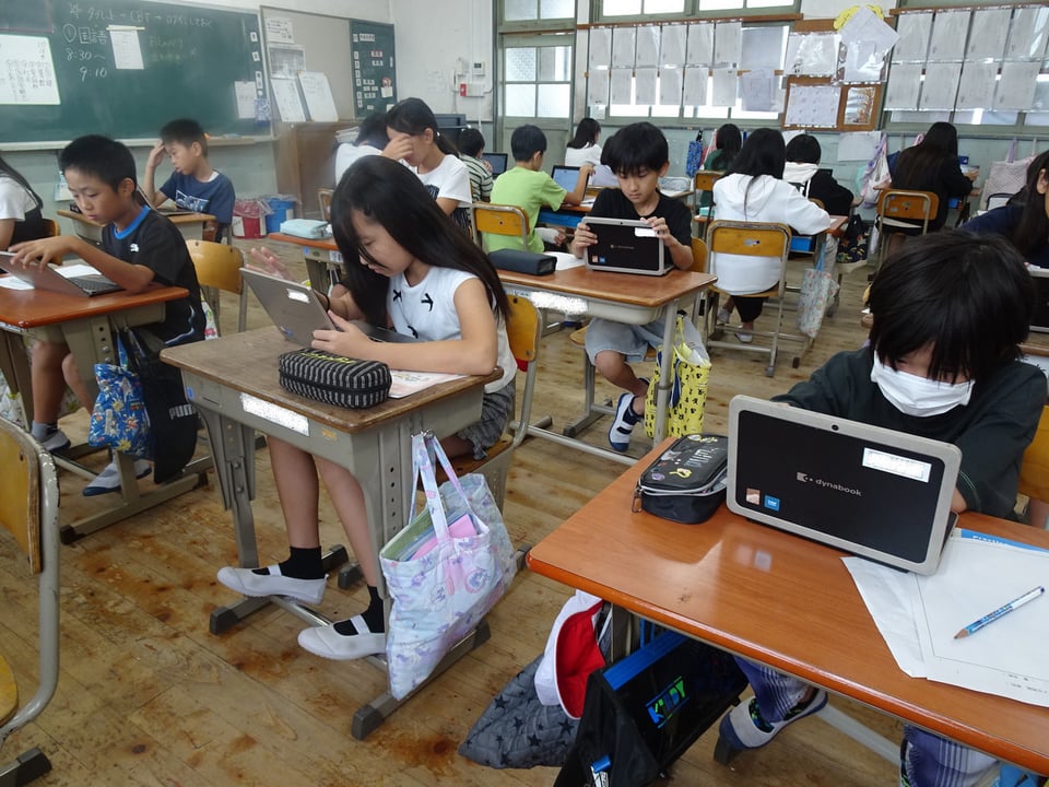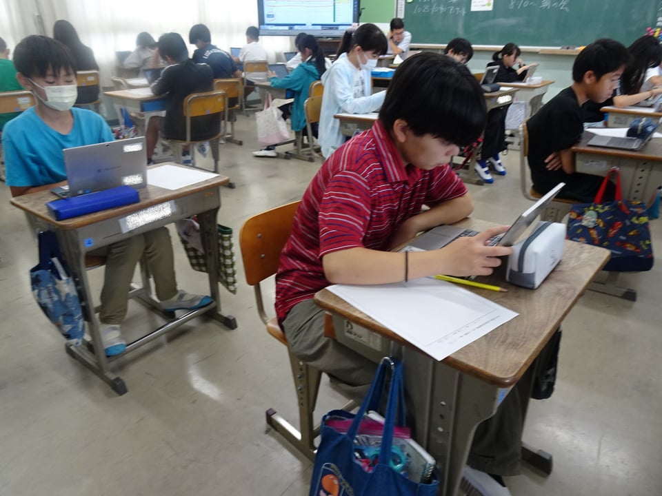5・6年生が学力定着状況確認問題に取り組みました。これは、4月に行った全国学力・学習状況調査、学力定着状況確認問題の結果と比較して現在の学力状況を把握・分析することで、指導の工夫改善を図り、学力の確実な定着につなげるためのものです。今年度は国語・算数の2教科と質問紙にCBT(Computer Based Testing:コンピュータ上で実施される試験)で取り組みました。どの子もタブレットに向かい合い、時間いっぱい問題に取り組んでいました。