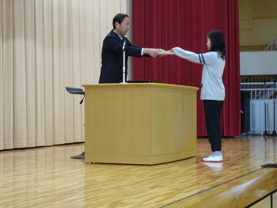 令和6年度の修了式を行いました。代表児童に修了証書を授与した後、校長から「この一年間、一人一人のよさが輝く場面があった。それぞれの成長を振り返り、来年度につなげてほしい。」という話をしました。式の後は大掃除をして、各教室で最後の学活をしました。一人一人が担任から通知表・修了証書を受け取り、この一年間の頑張りや思い出を振り返っていました。保護者や地域の皆様には、様々な面からご支援・ご協力をいただきましたことに、心から感謝申し上げます。来年度も子どもたちのよさが輝くよう、教職員一同頑張っていきますので、変わらぬご支援・ご協力をいただきますよう、よろしくお願いいたします。