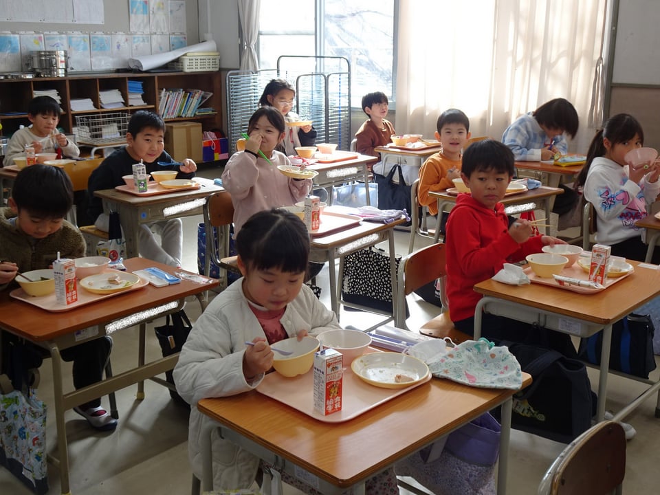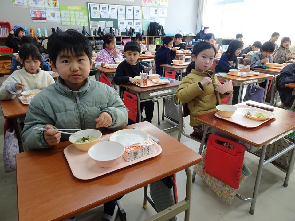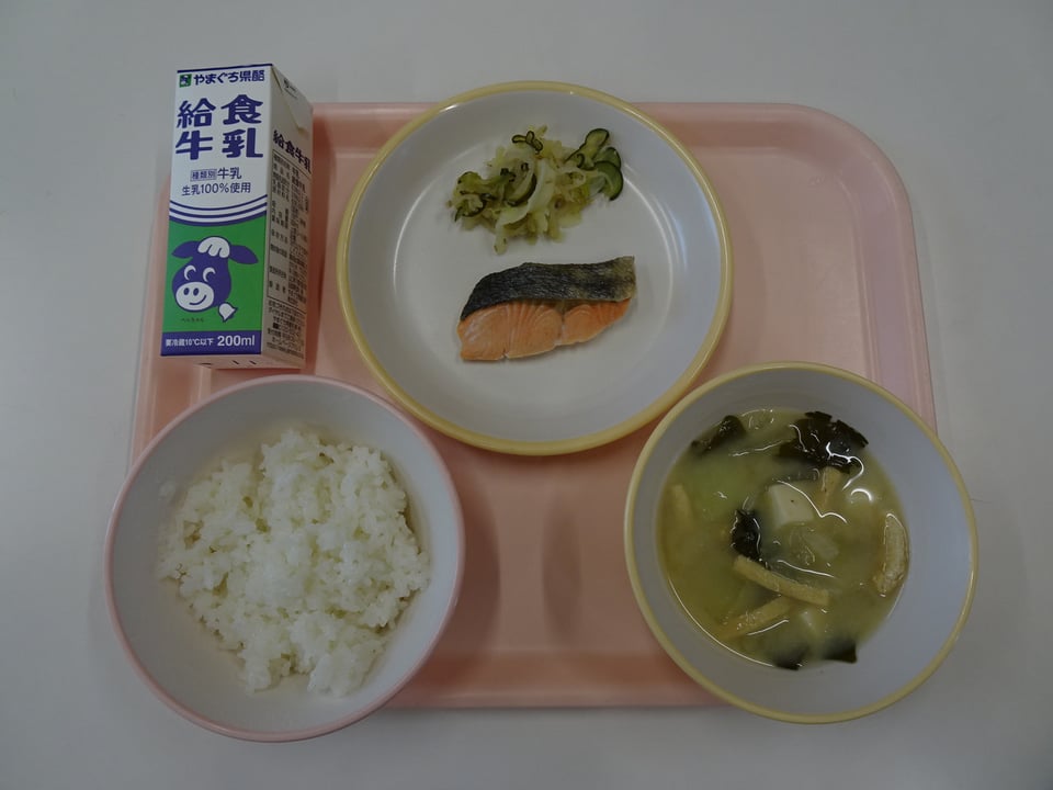 1月24日から30日は全国学校給食週間です。戦後、食べ物がなくて困っている子どもたちのために、食材の寄付を受け、給食を始めることができたことに感謝する意味で定められました。これに合わせて、今週の給食は学校給食週間メニューが提供されます。今日は「昔の給食」ということで、明治22年に山形県の鶴岡市で初めて作られた給食にちなんで、ごはん、みそ汁、鮭の塩焼き、即席漬け、牛乳というメニューでした。給食週間を通して、食べ物の大切さや給食が多くの人に支えられていることなどを考えさせていきたいと思います。