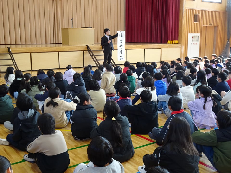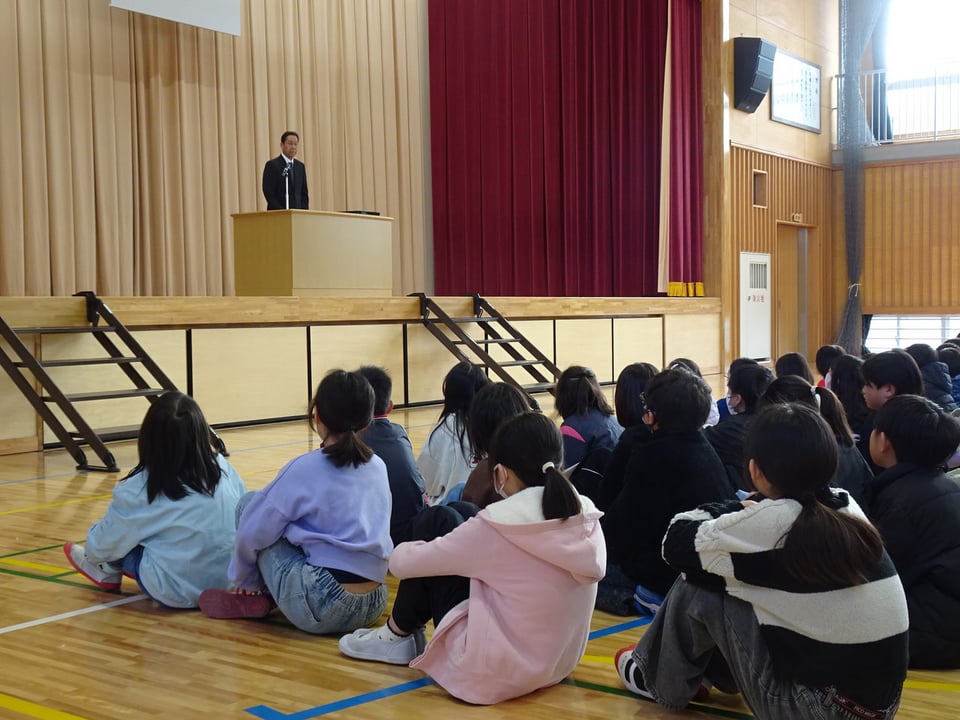 令和7年度の修了式を行いました。最初に代表児童に修了証書を渡しました。校長からは、「この一年間に自分が頑張ったこと、できるようになったこと、まだ足りないなと思うことを振り返って、次の学年につなげてほしい。」という話をしました。また、生徒指導主任からは春休みの過ごし方について指導しました。ぜひご家庭でもお子様とゆっくりと今年度の振り返りをしていただければと思います。明日から他市町より一足早い春休みに入ります。事件や事故にあわないように気を付けて、楽しい春休みにしてほしいと思っています。保護者の皆様、地域の皆様には、この一年間、様々な面からご支援、ご協力をいただき、深く感謝申し上げます。来年度もどうぞよろしくお願いいたします。