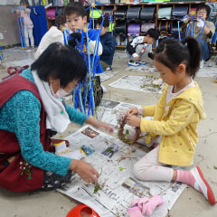 1年生がアサガオのつるを使ったリース作りをしました。今日は地域の皆さんにお手伝いしていただき、支柱に絡まったつるを外し…