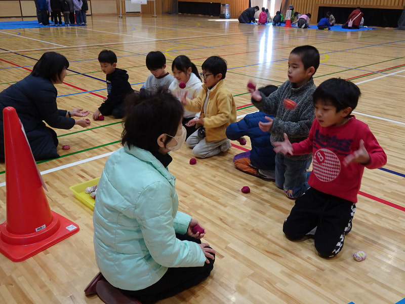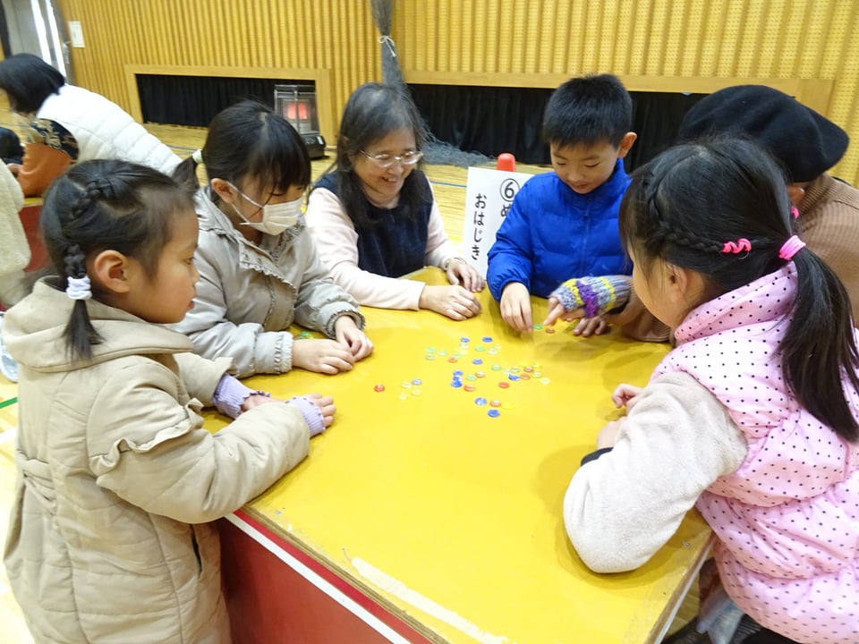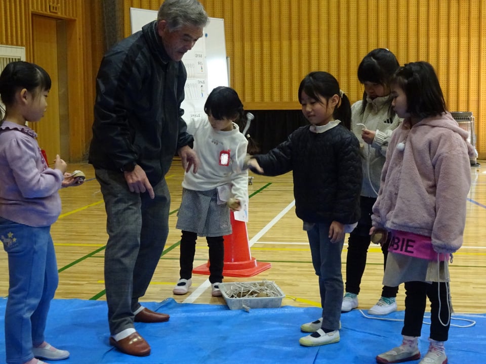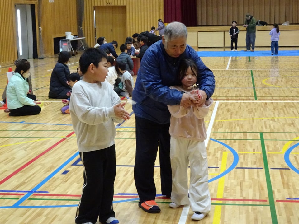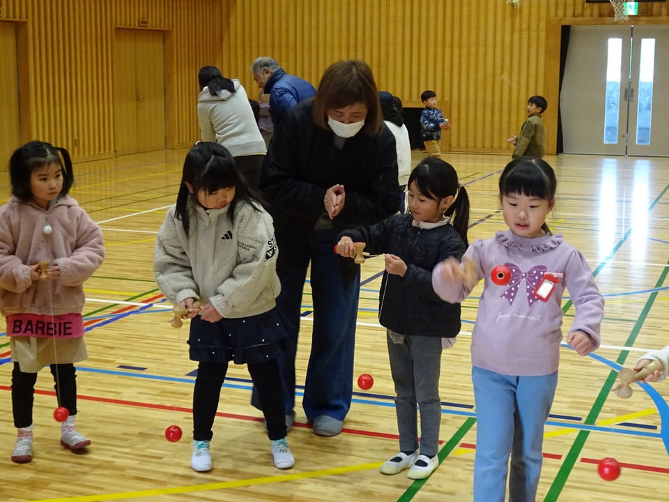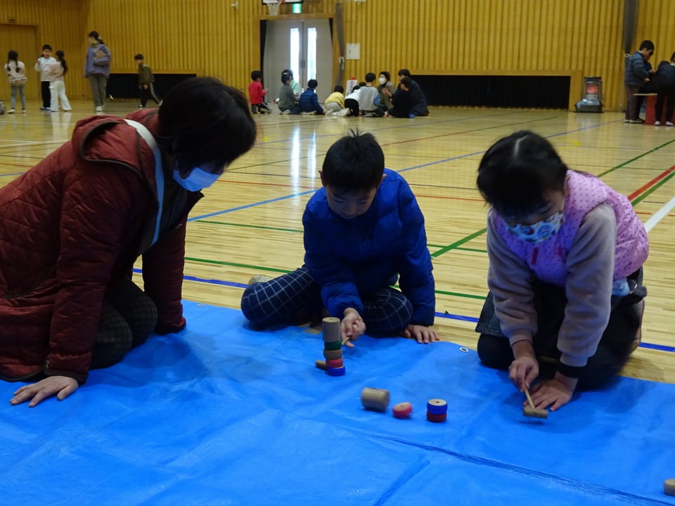 1年生が地域の方々から昔の遊びを教わりました。会場の体育館には、竹とんぼやけん玉、こま回しなど6つのコーナーが作られ、子どもたちは順番に遊びを体験しながら回っていきました。慣れない遊びにうまくできない様子も見られましたが、地域の皆さんと交流しながら楽しい時間を過ごすことができました。