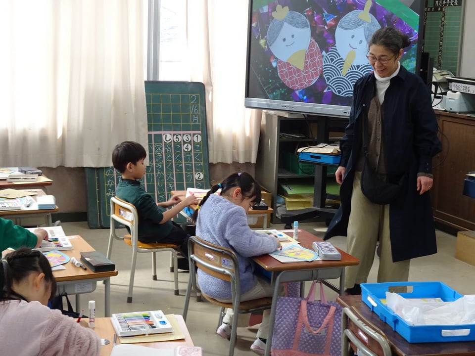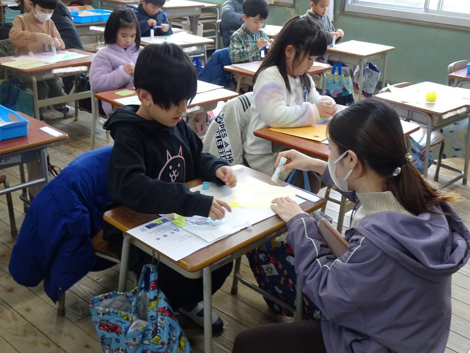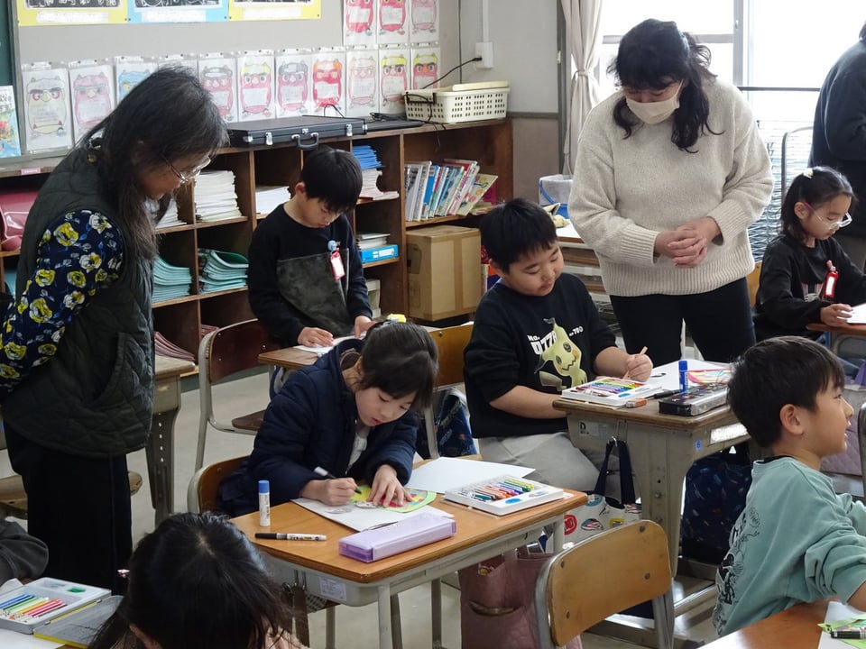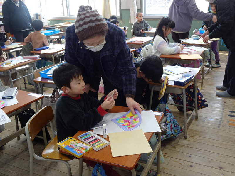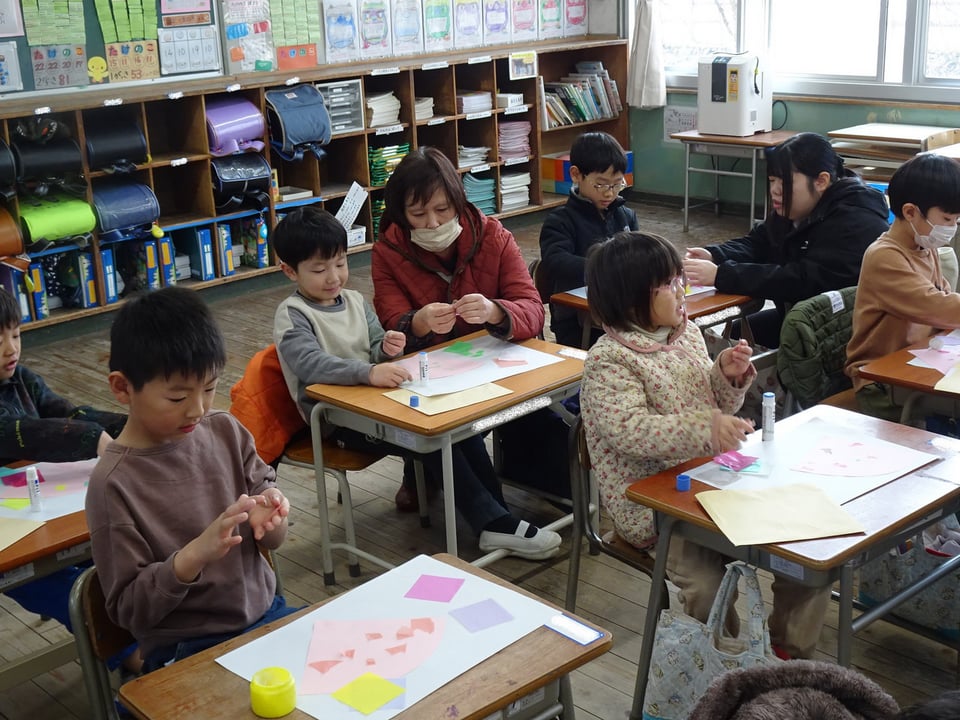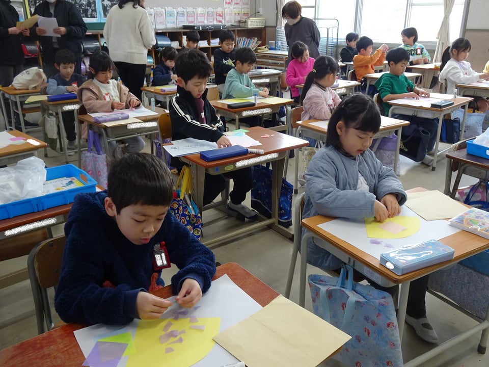 1年生が「神原ひなまつり」の会場に飾られるひな人形作りに取り組みました。多くの地域の皆さんに教えていただきながら、今年はステンドグラス風の台紙を作り、その上にお内裏様とお雛様の型紙を貼りつけていきました。一つ一つの作業を根気強く行い、最後に目や口をかきこむと、それぞれの子どもの個性があふれる作品ができ上がりました。「神原ひなまつり」は2月27日(金)から神原ふれあいセンターで開かれますので、ぜひ会場でご覧ください。