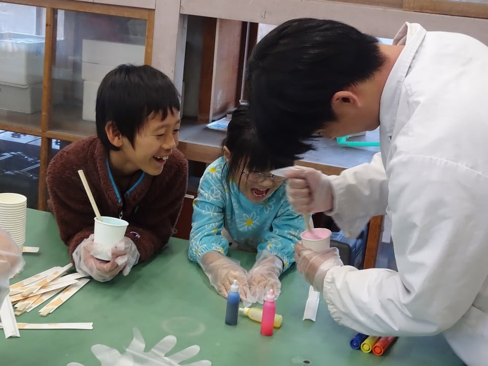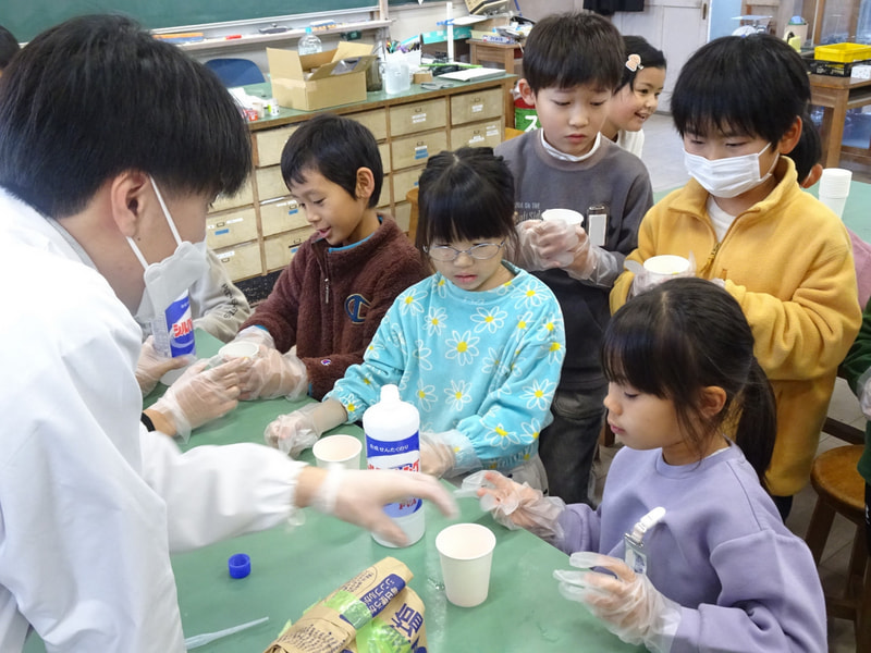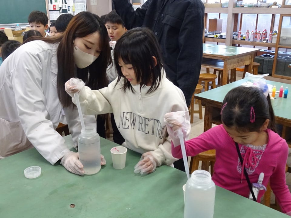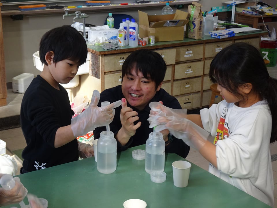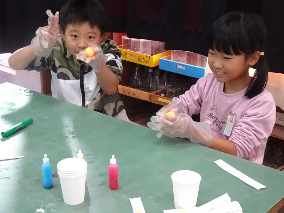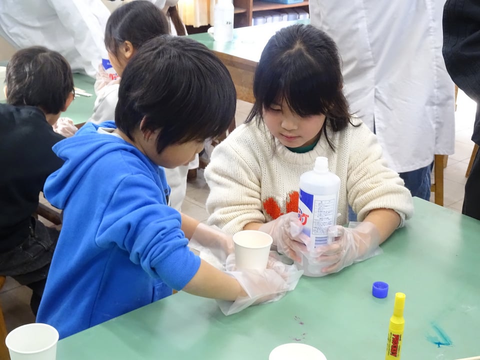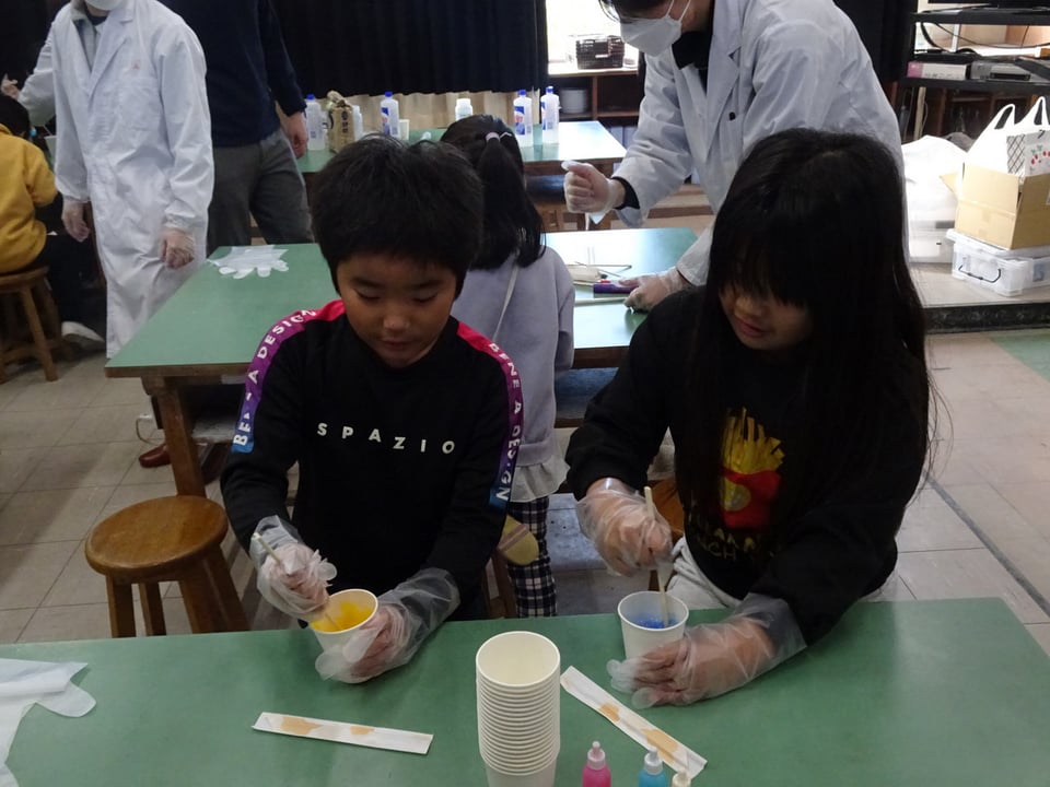 一昨日に続き、宇部高専物質工学科の皆さんによる出前授業を行いました。今日は2年生が「スーパーボールづくり」に挑戦しました。紙コップにホウ砂と洗濯糊、蒸留水を入れて混ぜていくと、色とりどりの「スライム」ができました。さらに、食塩を加えて混ぜると徐々にかたまりになり、水分をしぼって丸めるとスーパーボールの完成です。スライムを作ったことがある子は結構いましたが、スーパーボールは初めての子ばかりで、楽しそうに机の上で弾ませていました。物を混ぜ合わせることで、物がいろいろな性質に変わる楽しさを味わうことができました。
