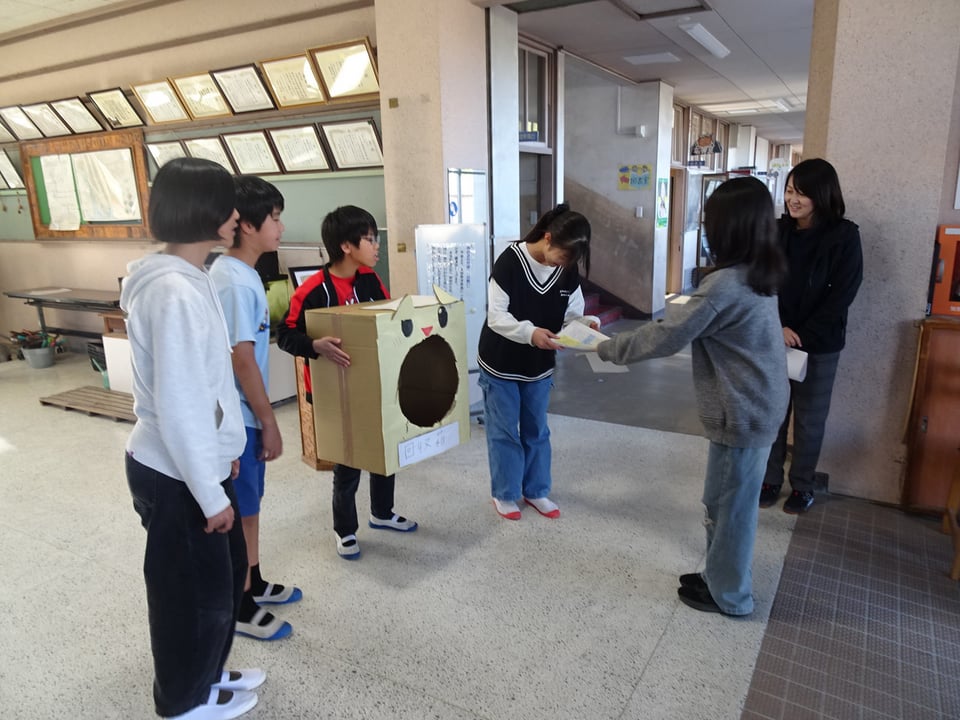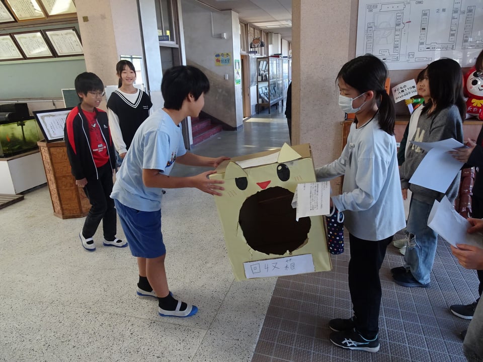 宇部中央高校と神原中学校区3校で、毎年「服のチカラプロジェクト」に取り組んでいます。これは、ユニクロやジーユーを展開しているファーストリテイリング社が主催しているもので、家庭で使わなくなった子ども服を集め、難民の方々や衣服を必要としている人たちに届ける取組です。今年度は見初小学校がオンラインの出前授業に参加し、中心になって活動しています。今日は見初小学校の運営委員の皆さんが手作りの回収箱とクラスに掲示するチラシを持参してくれ、代表で本校の運営委員会の6年生が受け取りました。回収は12日(水)から20日(水)までを予定しています。ご家庭でも回収にご協力くださいますよう、よろしくお願いいたします。