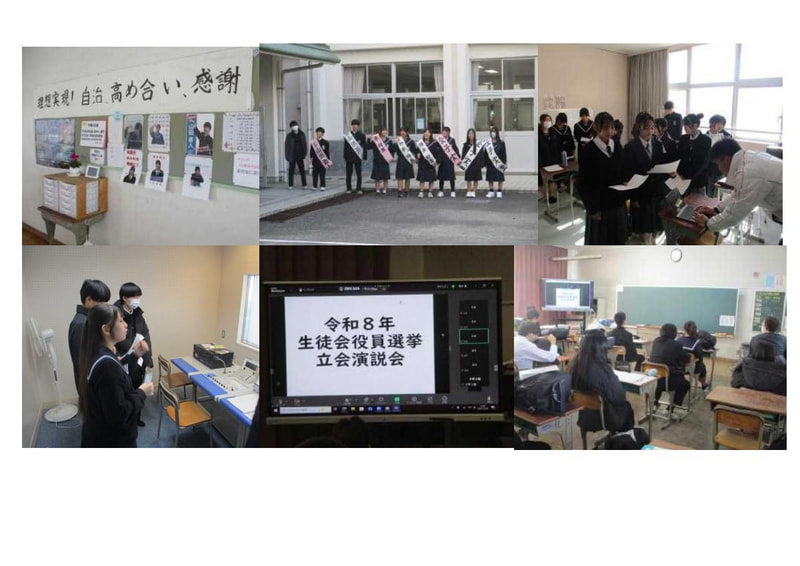 気温やインフルエンザ等も考慮して今回、候補者は演説を放送室から行い、一般生徒は教室で、電子黒板に映された候補者の画面を見ながら、演説を聞きました。その後体育館に移動して投票を行いました。(ちなみに投票箱は市選挙管理委員会から借りてきた本物を使用しています)
