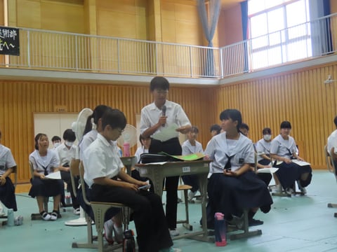 「校則の見直し」については、ニット帽の着用、授業中のひざ掛けの許可、コートなどの色について検討をしました。全校生徒から出た意見を参考に、生徒会が原案を出し、「校則見直し委員会」で協議していきます。「みんなが支え合う神原中にするために」では、各クラスから提案がなされた4つの案から多数決で、「チームともだち」に決定しました。