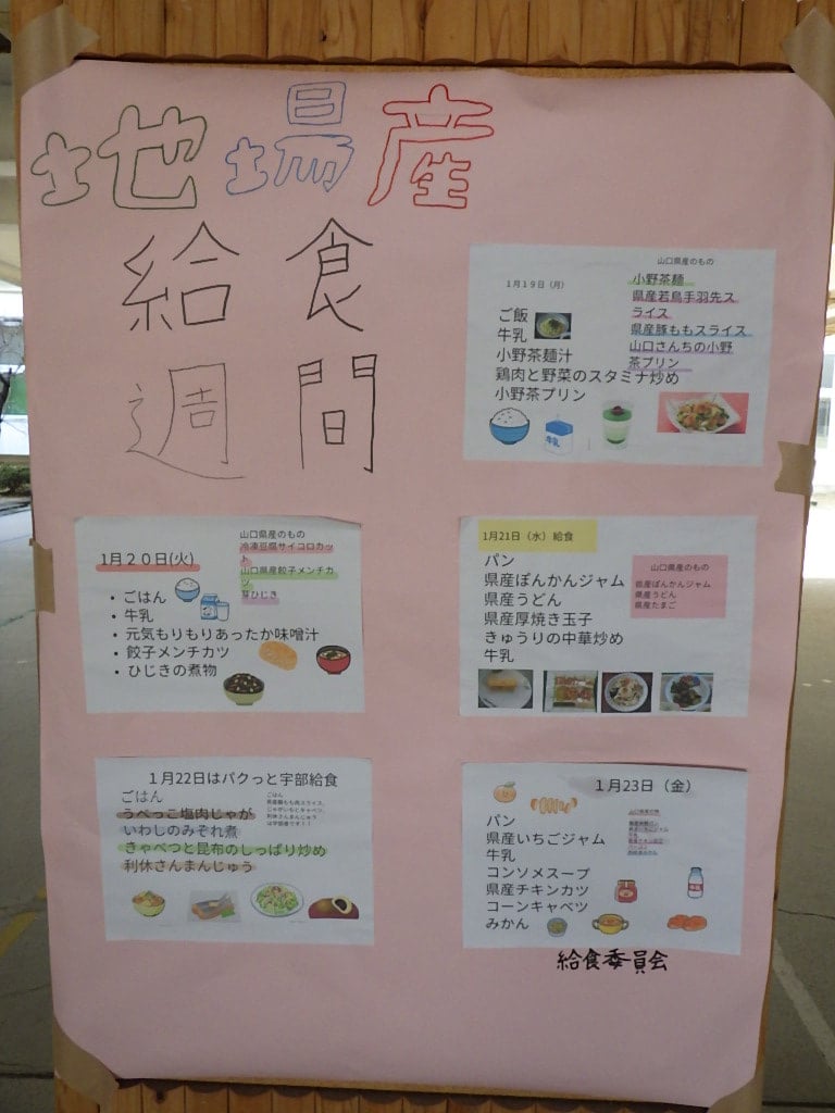 今週は、地場産給食週間です。小野茶麺、小野茶プリン、芽ひじき、ぽんかんジャム、鶏もも肉、じゃがいも、西岐波みかんなどなど地元の食材がたくさん使われます。給食をとおして、食への関心が高まることを期待しています。
