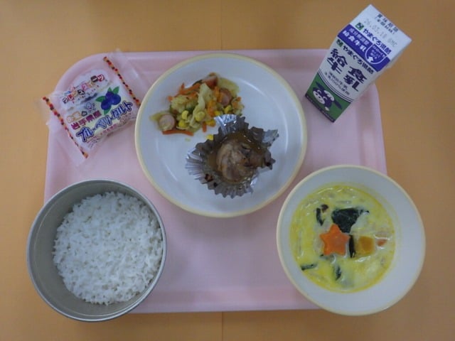 アピールポイント 【マーマレードチキン】いろいろなビタミンが入って体にいい。【スープ】栄養が満点で肉類も入っていて、野菜の風味を楽しみながら、だしの味も楽しめる新メニュー【ウィンナーとピーマンの盆踊り】栄養もよく人気も高く食べやすい【タルト】フルーツタルトはこれまで出ていないと思った。おいしい。【ごはん】なんにでも合うし、午後の授業を頑張るためのエネルギーになる【牛乳】カルシウムは骨を強くする。身長が大きく伸びる小学生には必要な栄養。