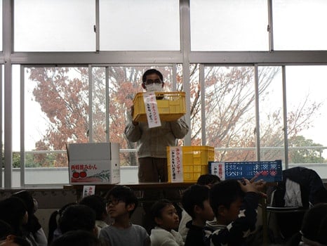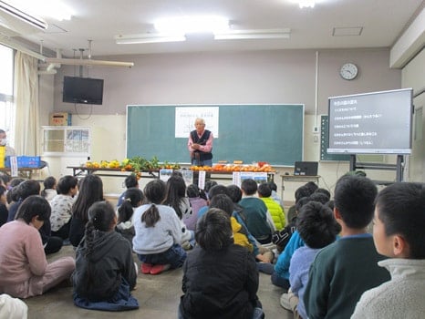 12/17(水)に西岐波みかんについて学びました。みかん作りに携わっておられる生産者の方々にお越しいただき、みかんが育つまでの工夫や大変さなどについてお話を聞きました。子どもたちは、実物のみかんの木やさまざまな種類のみかんを目の前にしながら、興味津々の様子で説明に耳を傾けていました。