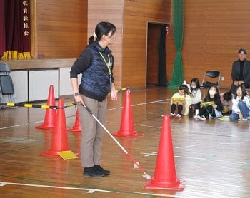盲導犬のアクアちゃんと講師の方をお迎えし、視覚障害のある方の生活や白杖の使い方、盲導犬の仕事について実演を交えて教えていただきました。これまでの学習をふまえながら、盲導犬の大切な役割や賢さ、仕事以外での穏やかな姿についても知ることができました。また、まちで出会った際の接し方についても学び、理解を深める時間となりました。