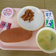 4月17日(月)今日は新1年生が初めて給食を食べる日でした。献立は、パン、コーンスープ、ミートマカロニ、お祝いゼリー で…
