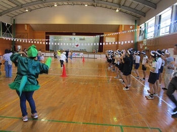 川上地区の母子保健推進協議会の子育てサークル「ちびっ子の輪」の運動会が本校体育館で開催され、6年生も一緒に参加して会を盛り上げました。主役は、まだよちよち歩きやハイハイの段階のちびっ子たちばかり。6年生が大人のように見えます。