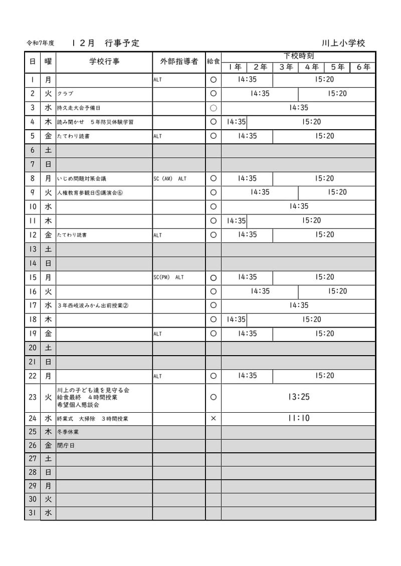12月の行事と下校時刻(163KB)