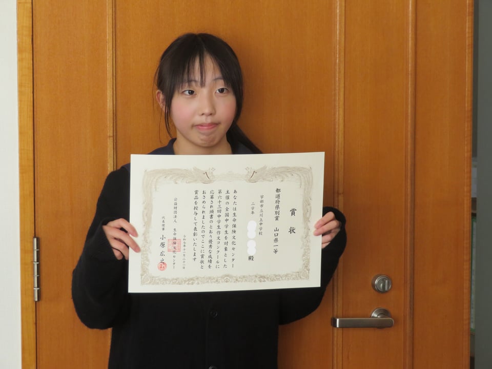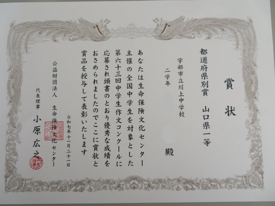 生命保険文化センター主催、第63回中学生作文コンクールにおいて、2年生のY・Tさんの作文が、都道府県別賞 山口県一等となりました。県応募作品506点の中の第1位です。作文は、家庭での実体験や本人の思いがしっかり書かれていたのが審査委員に好評たっだそうです。受賞おめでとうございます。
