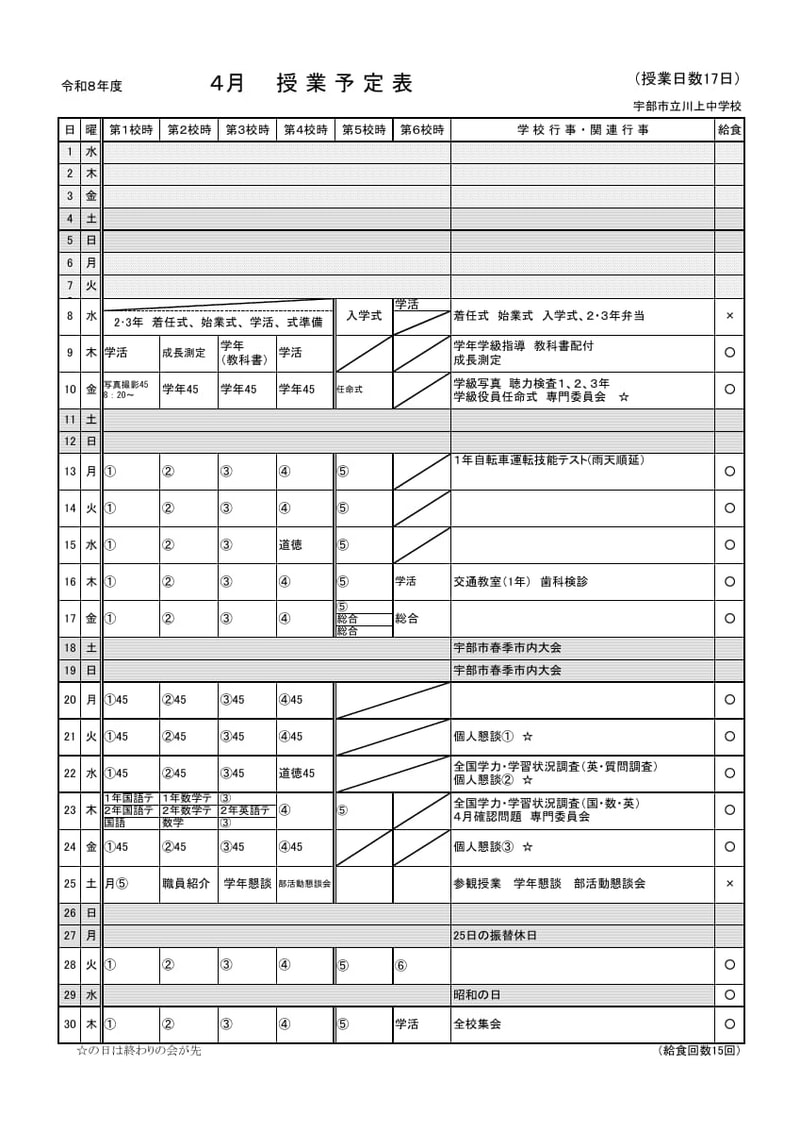 令和8年度4月行事・授業予定