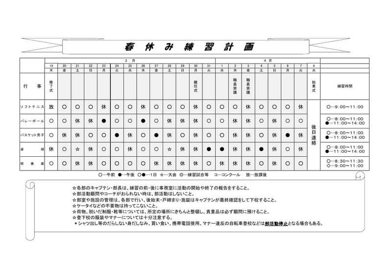 年度末・年度初め部活動計画表