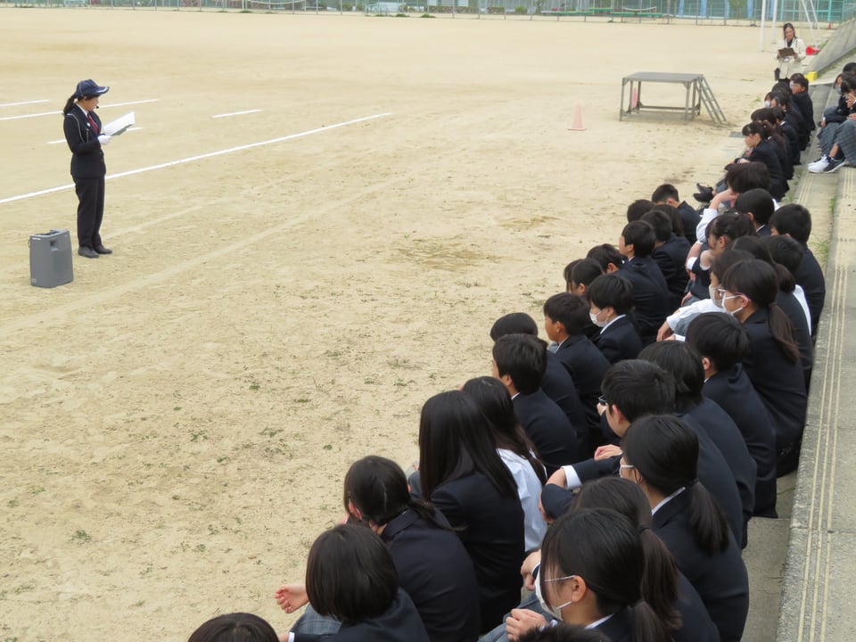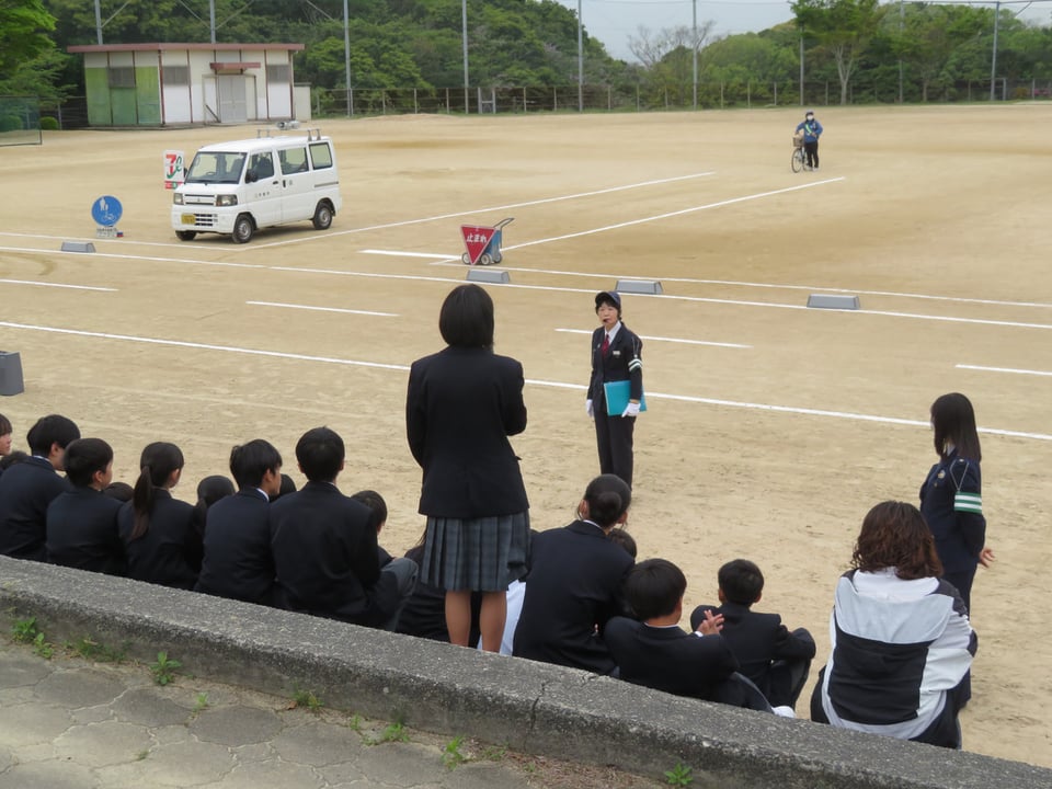 1年生を対象に自転車交通教室を実施しました。車と自転車の事故場面を再現していただき、事故が起きた原因について考えました。中学生になり、登校をはじめ、これまでよりも自転車を利用する機会が多くなってきます。被害者にも加害者にもならない安全な運転をしていきましょう。