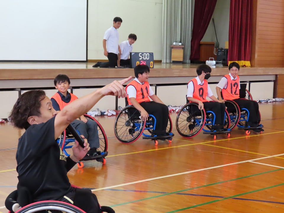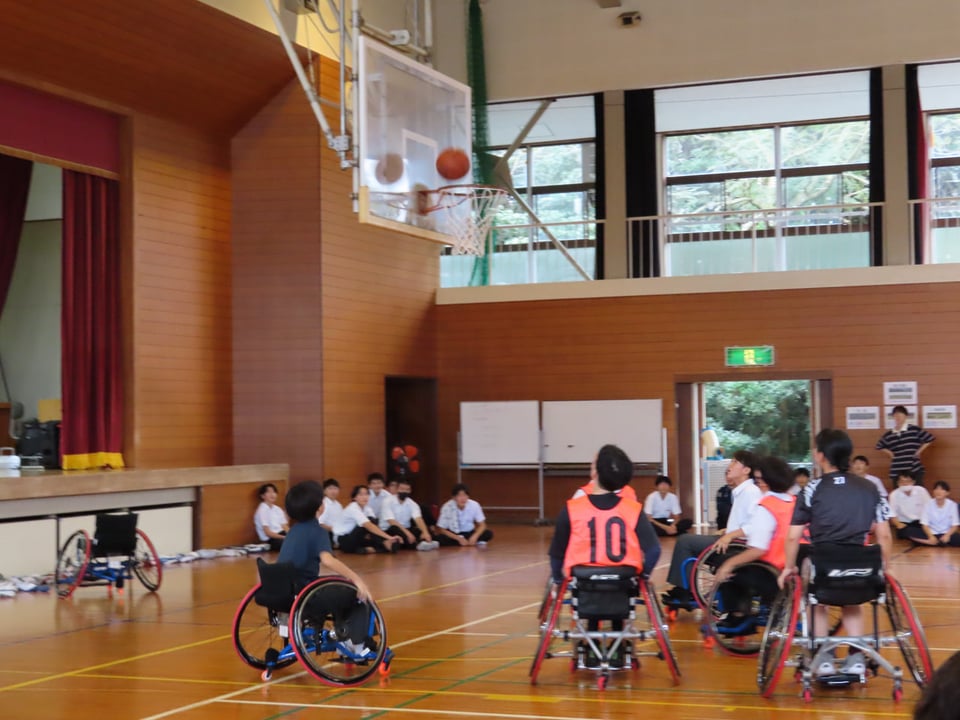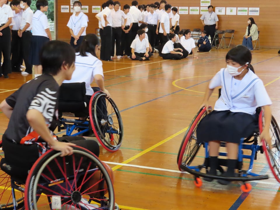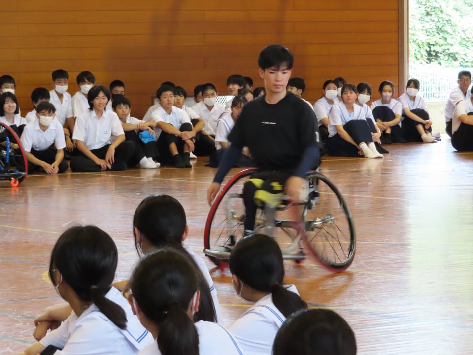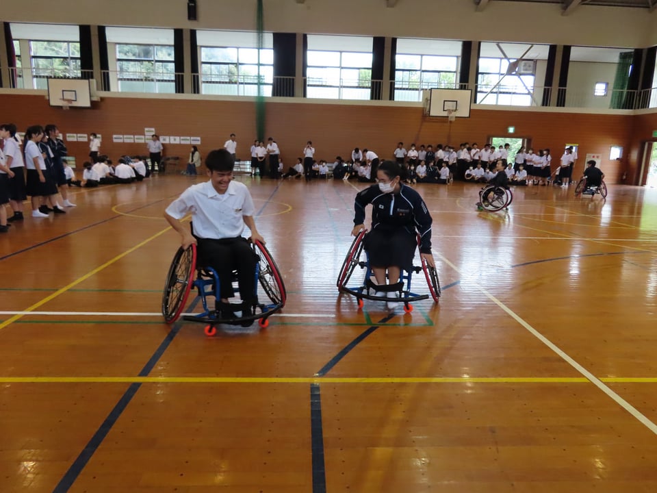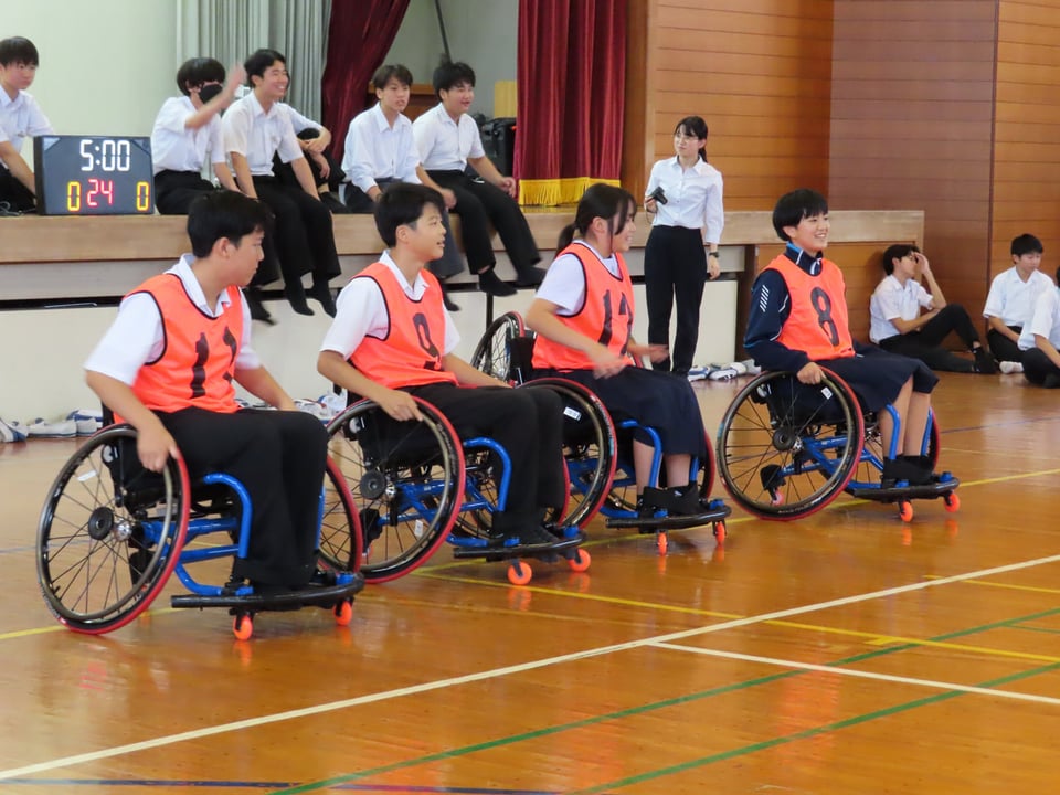 「パラスポーツを知る」という演題で、山口オーシャンズから倉田様他3名の方を講師にお迎えして人権講演会を実施しました。講演のみならず、競技用車椅子に全校生徒全員が乗る経験もでき、まっすぐ進むことや曲がることの難しさを実感しました。また、実際の試合では、プレーをする生徒はもちろん、見る側も楽しい時間となりました。