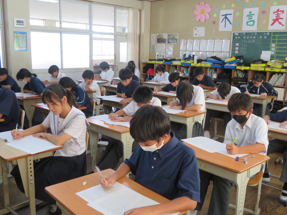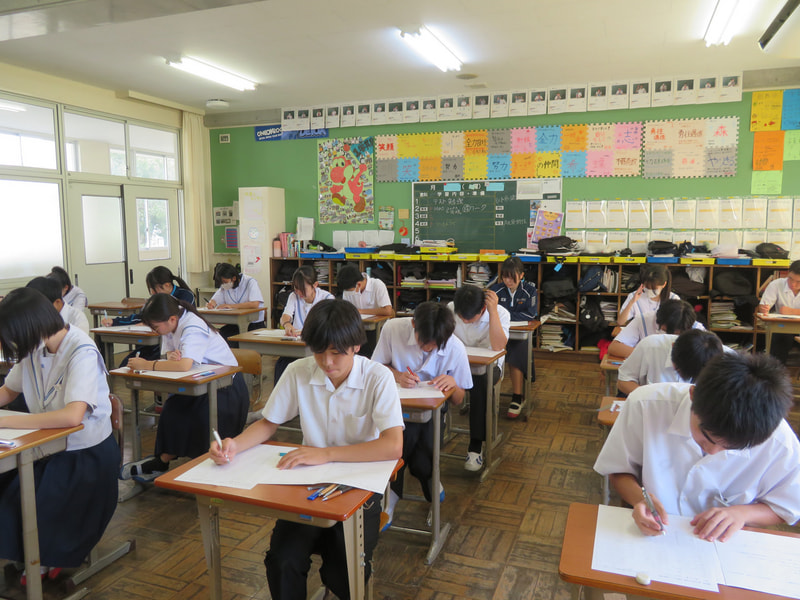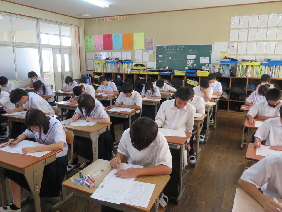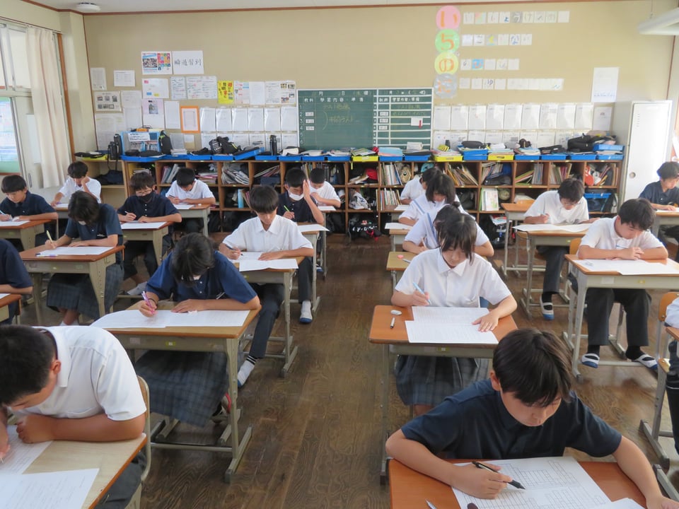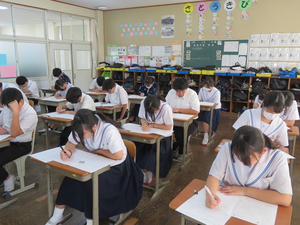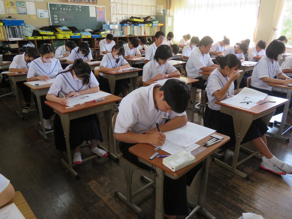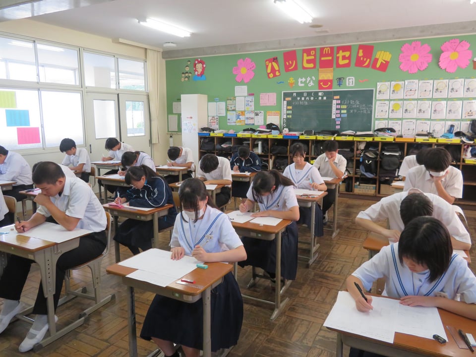 中間テストの様子です。テストの度に生徒の皆さんに伝えたいことは、テスト問題は、先生方が「これだけは、できてほしい。答えてほいい。解いてほしい。」と厳選した問題であることです。中間テスト後に、できなかった問題をクリアしていくことが、学力Upの近道です。