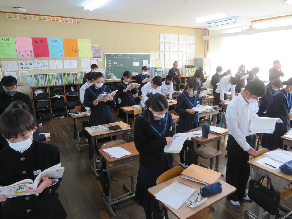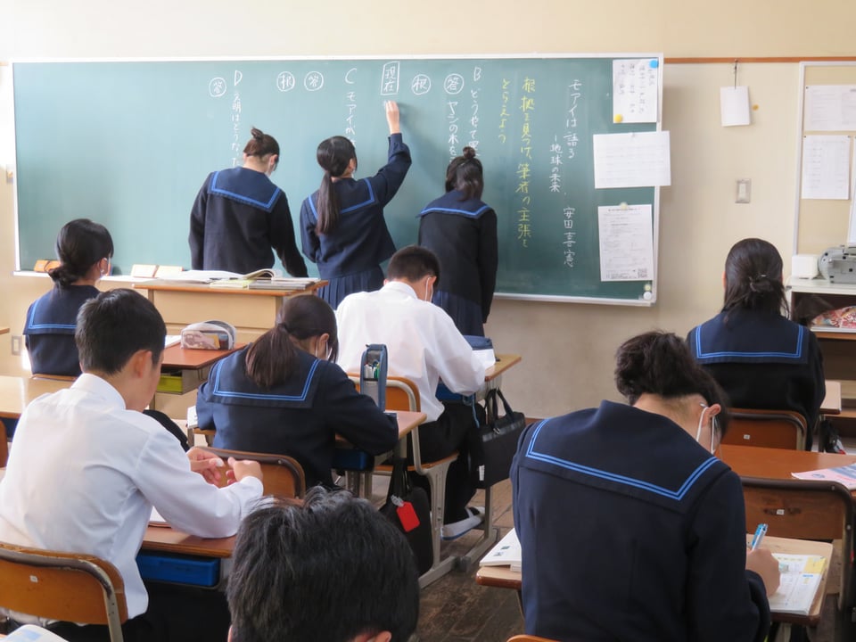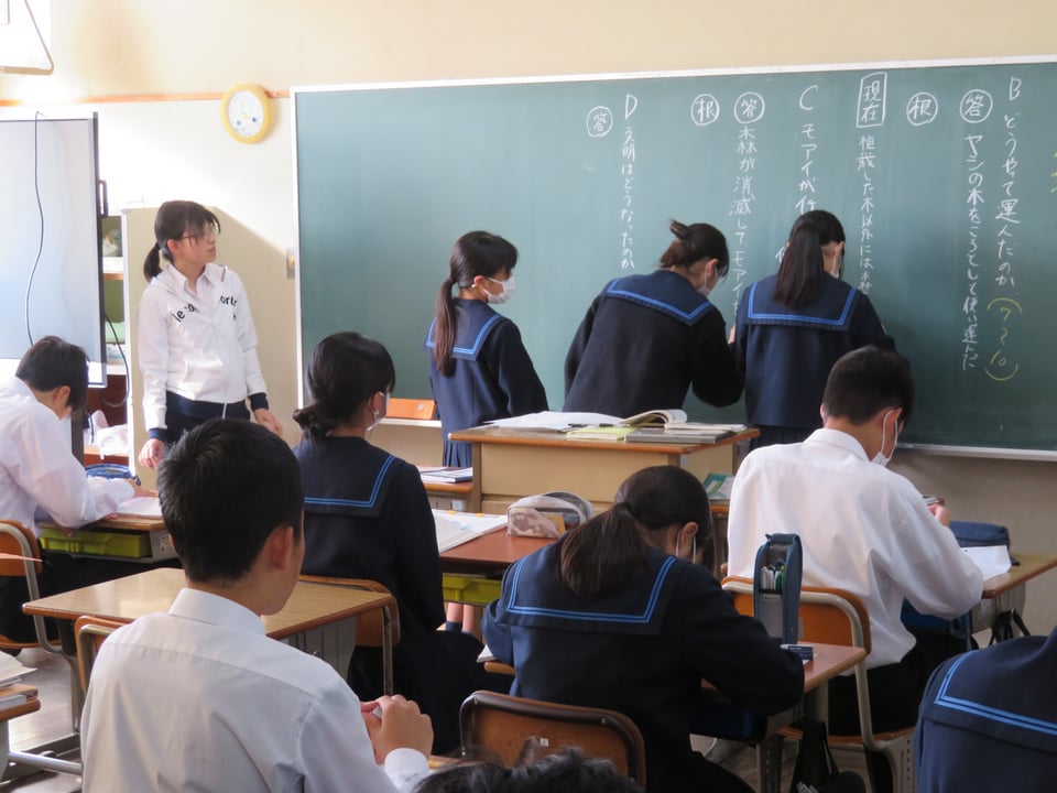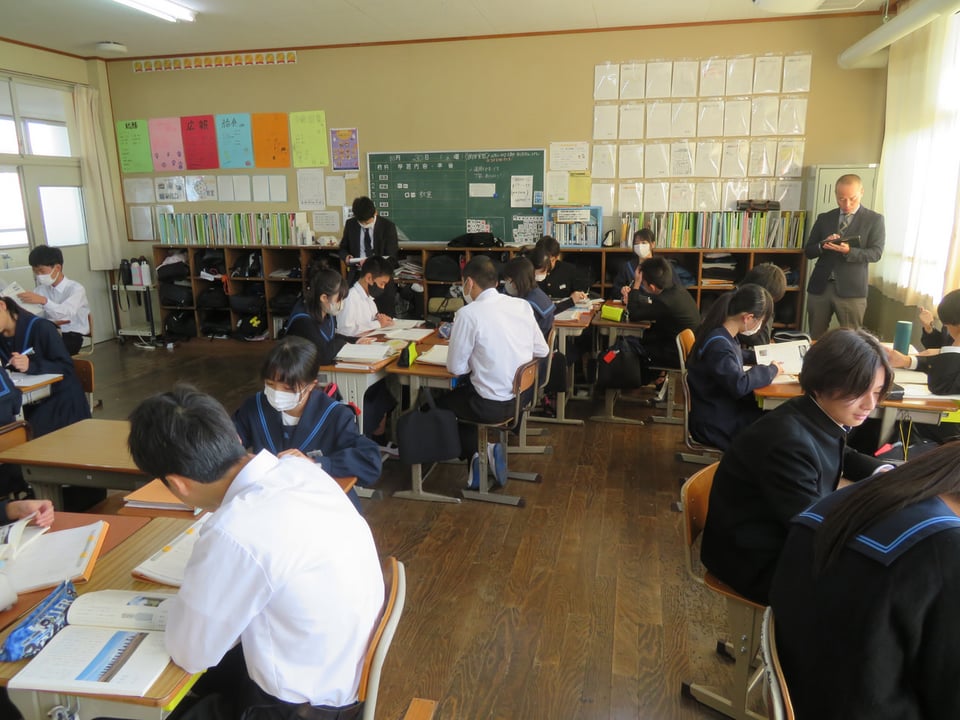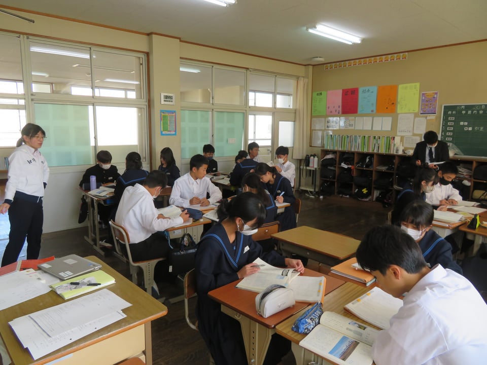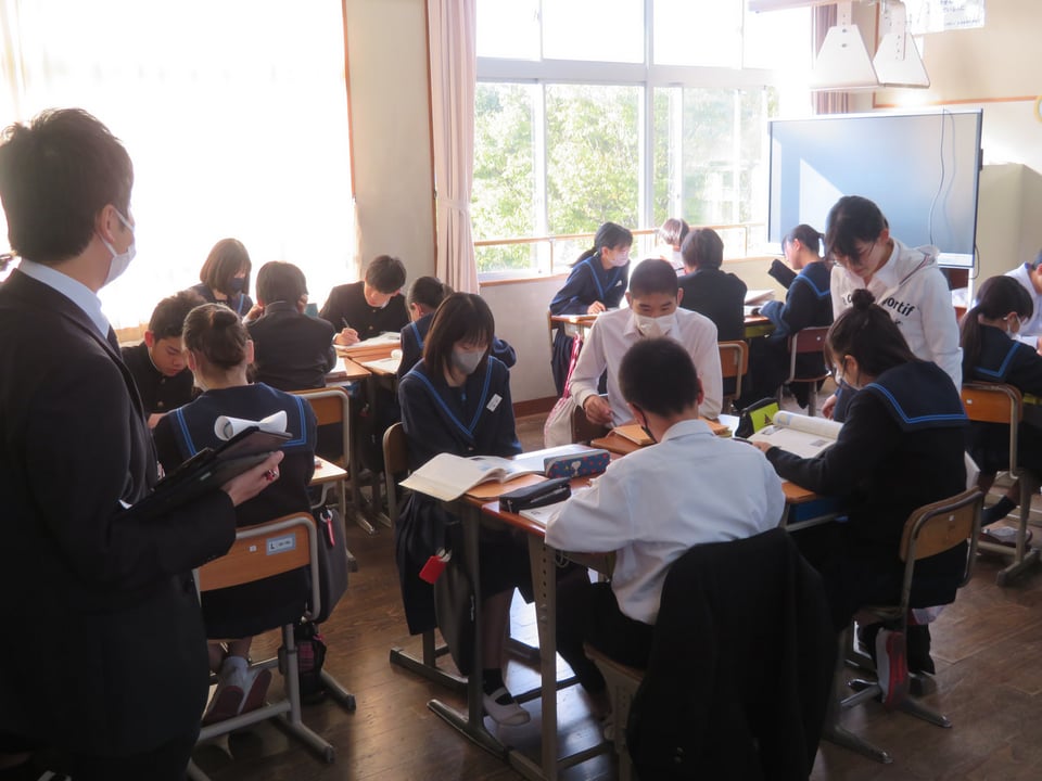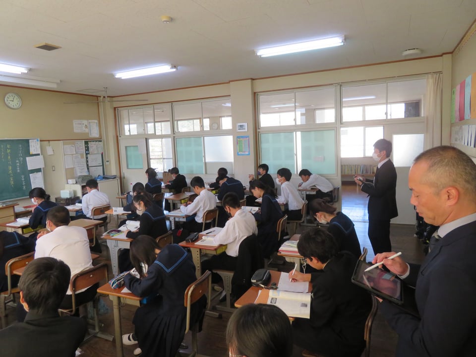 市・県の教育委員会の方が来校され、2年1組の国語の授業を参観していただきました。「モアイは語る」という説明的な文章を読み取り、筆者の主張を捉え、それを支える論理の展開の仕方について学ぶ内容でした。教育委員会の方から、K先生の授業準備や生徒の反応の良さについて褒めていただきました。