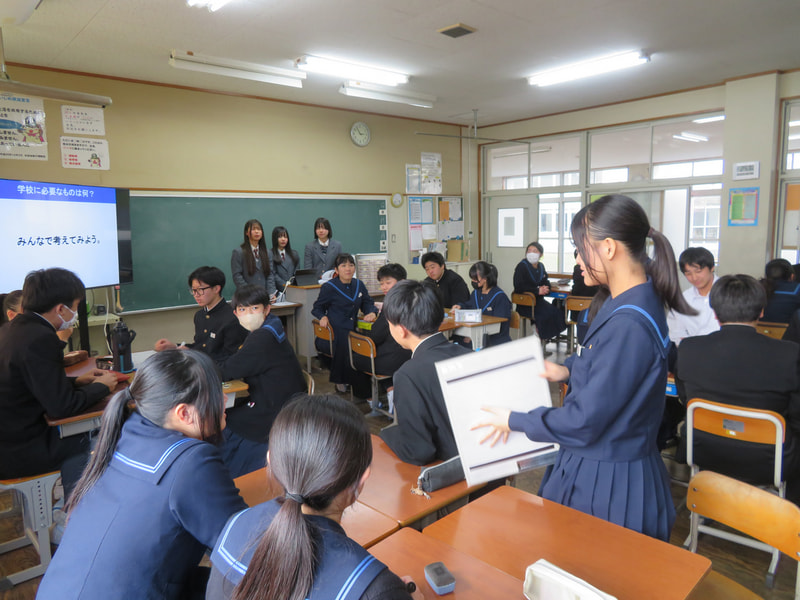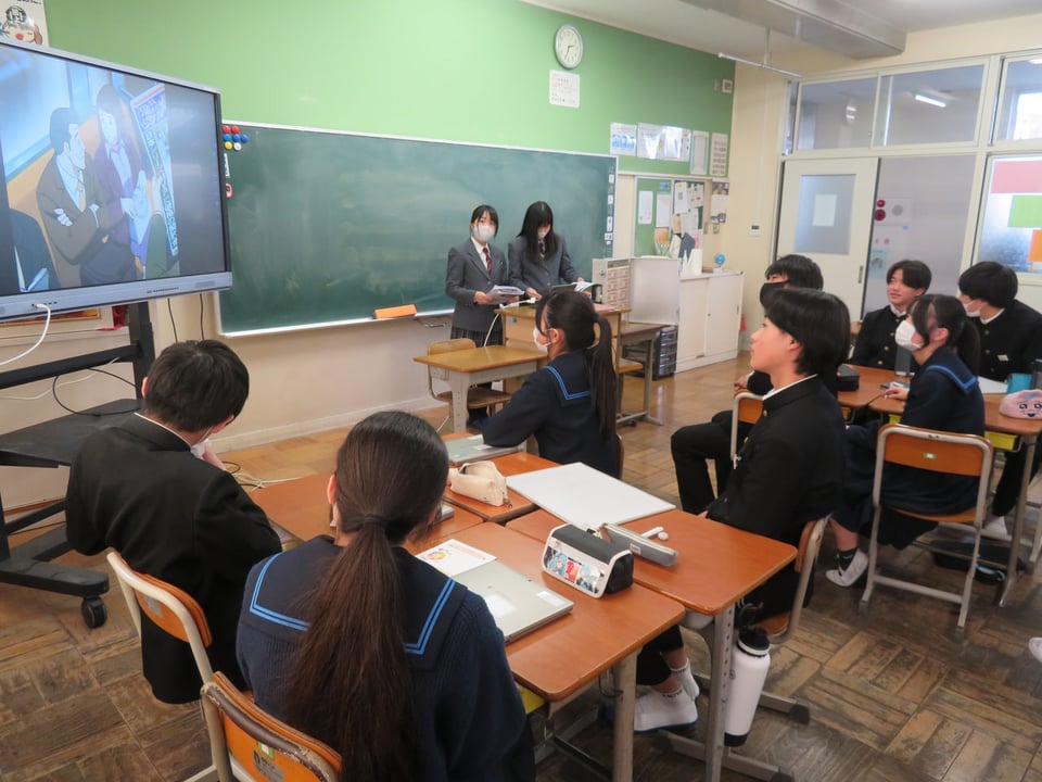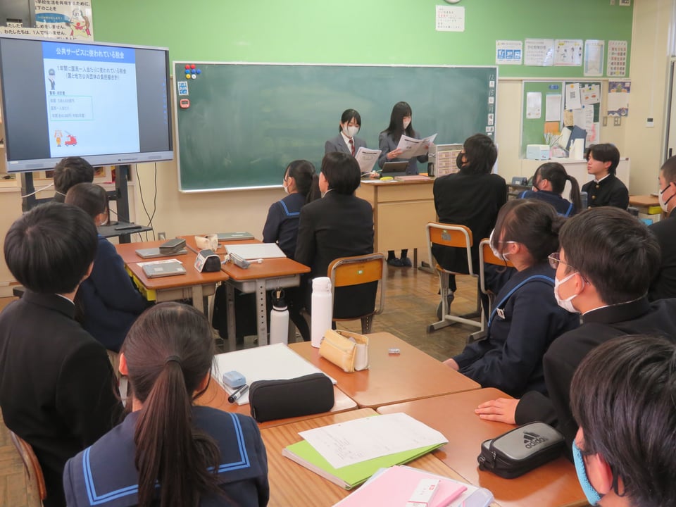 3年生を対象に租税教室を実施しました。今回の講師は、慶進高等学校2年生の7名です。嬉しいことに、その中には本校の卒業生もいます。授業では、税の種類・税金の必要性と公共サービスについて学んだのち、グループで税の集め方について考えました。高校生から受ける授業は大変新鮮であり、本校の生徒・高校生にとって良い経験となりました。