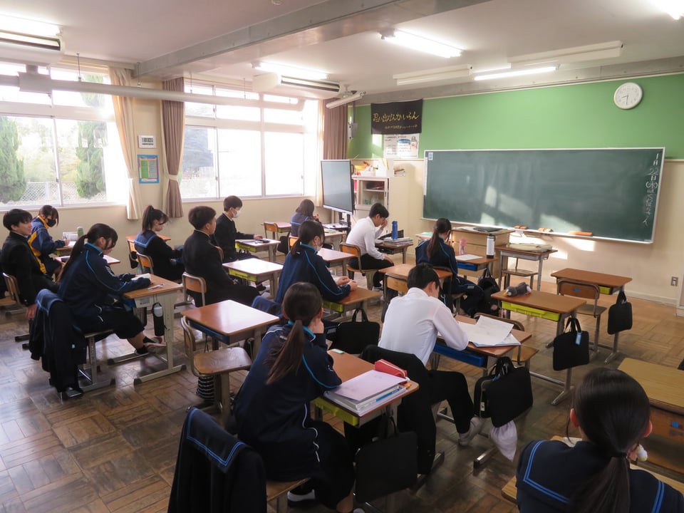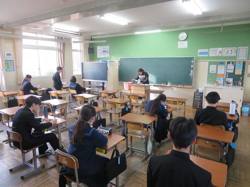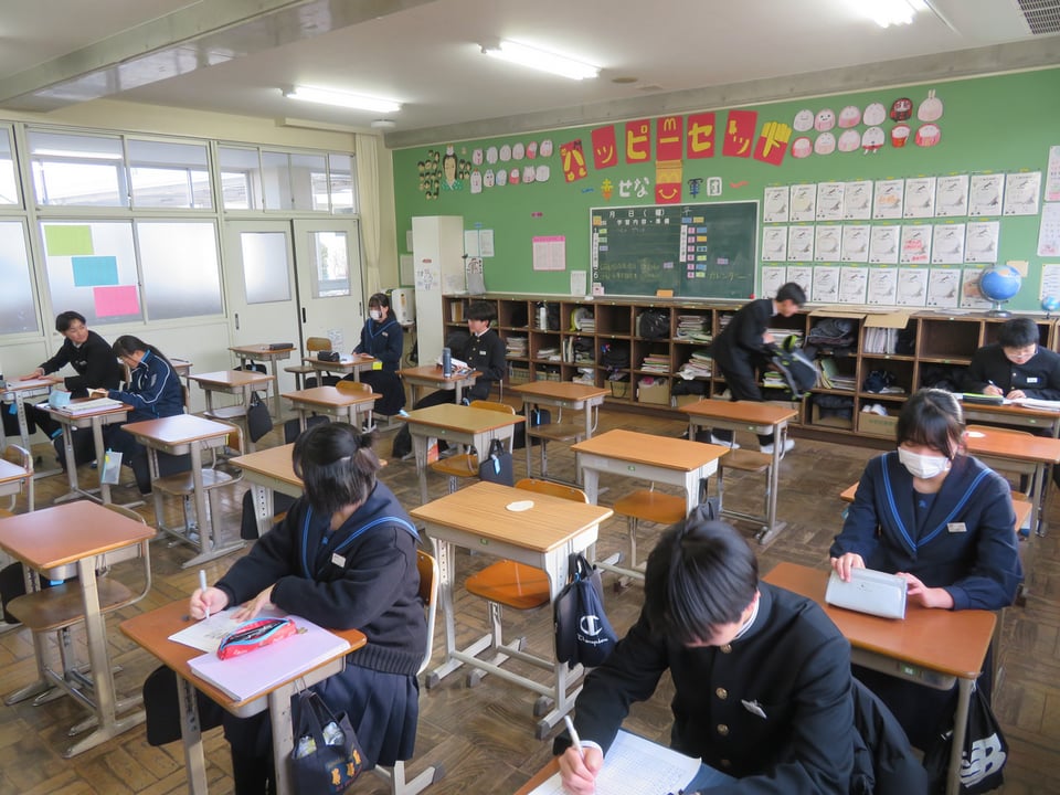 3年生の今朝の様子です。写真を見てのとおり、たくさんの空き机があります。理由は、本日、慶進高等学校一般入試が行われ、多くの生徒が受験に行っているからです。早いもので1月も後半に入り、3年生の卒業までの登校日数は残り30日となりました。3年生のみなさん、残り少ない中学校生活一日一日を大切に過ごしてくださいね。