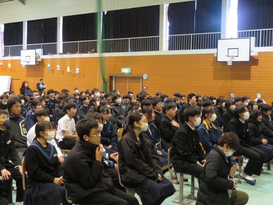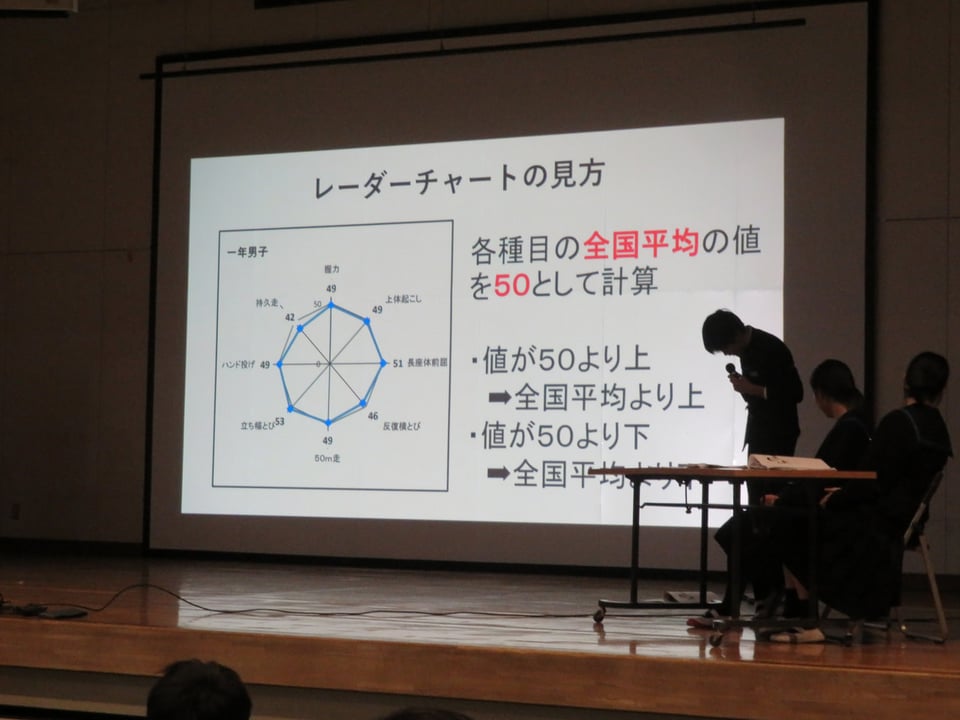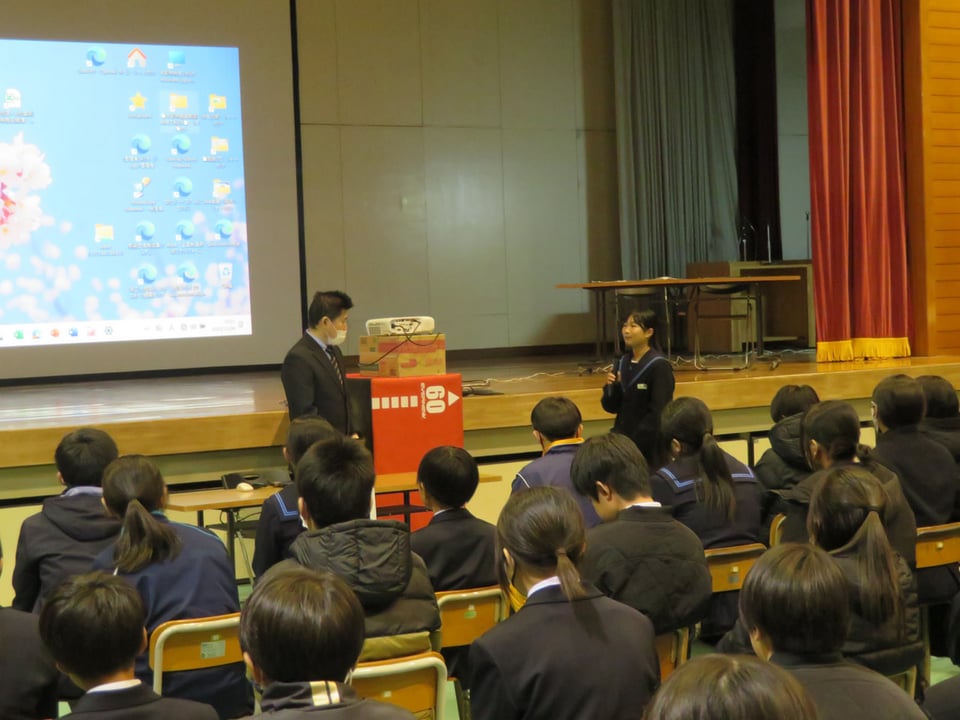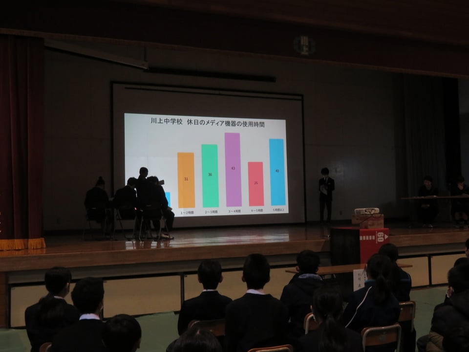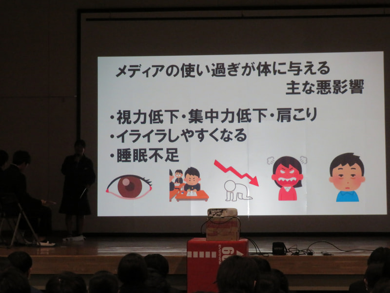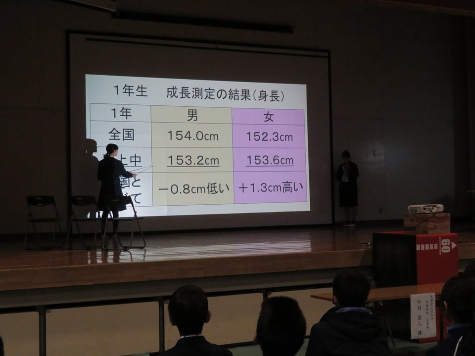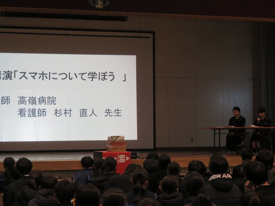 始めに保健委員会による定期健康診断・新体力テストの結果、メディア機器の使用についての調査結果の発表がありました。その後、高嶺病院看護師 杉村先生から「スマホについて学ぼう」という演題でご講演をしていただきました。頭では、スマホのメリット・デメリットは分かってはいますが、節度を考えて使用することは難しいものです。生徒のみなさん、使用時間・節度を考えて使用する時期ですよ。