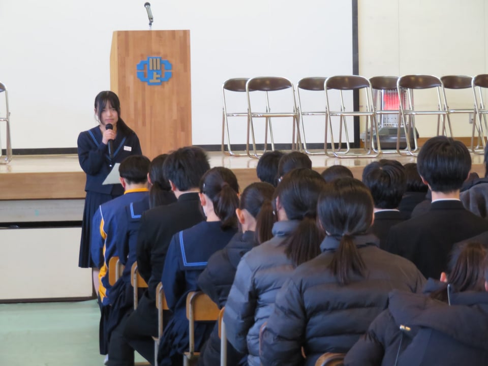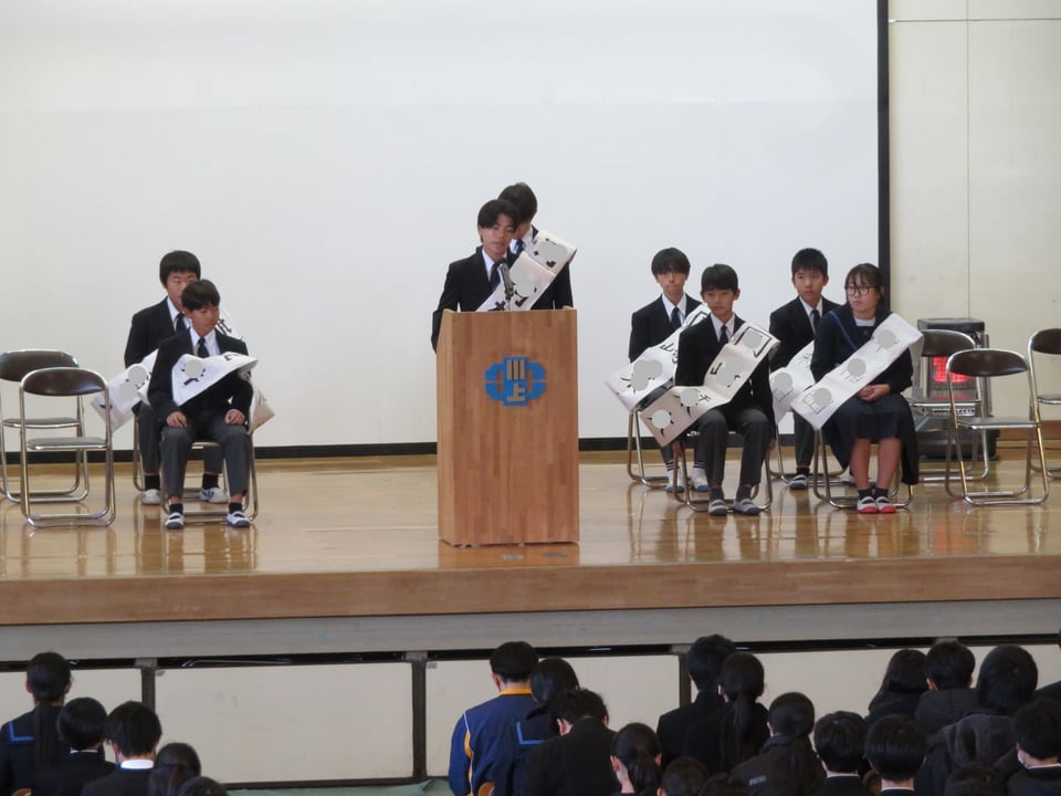 今週の月曜日から一週間の選挙活動を経て、本日、立会演説会を行いました。一年生は書記2名の定員に対して4名、二年生は会長・副会長・書記長の計4名の定員に対して9名が立候補しました。立会演説会では、立候補者は今後の川上中学校をより良くしていきたい公約を中心に自らの思いを熱く語りました。
