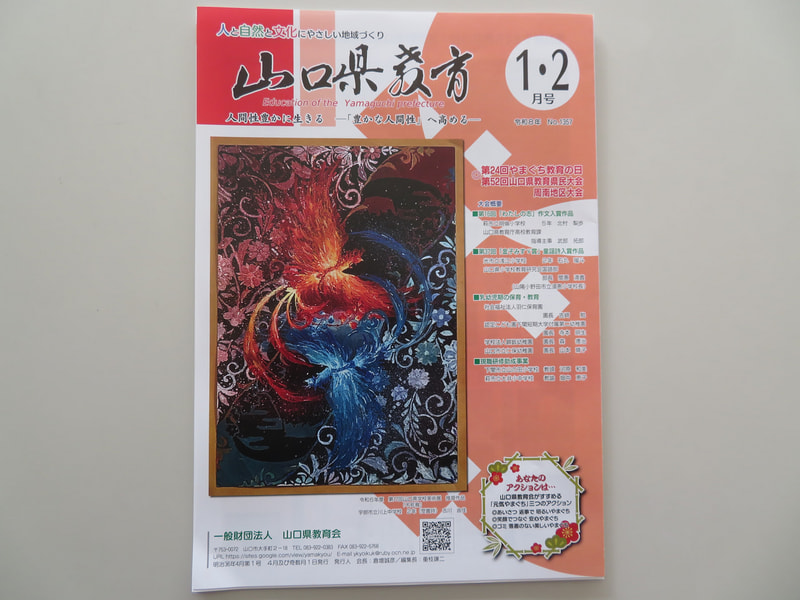 山口県教育という機関誌の表紙に3年生 古川由佳さんの作品が掲載されました。この作品は、本人が2年生のときに描いたもので、令和6年度 第77回山口県学校美術展 推奨作品に選ばれました。作品のタイトルは「不死鳥」です。