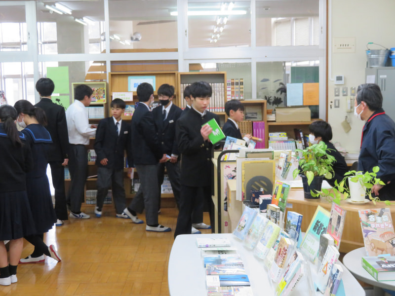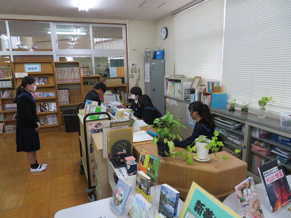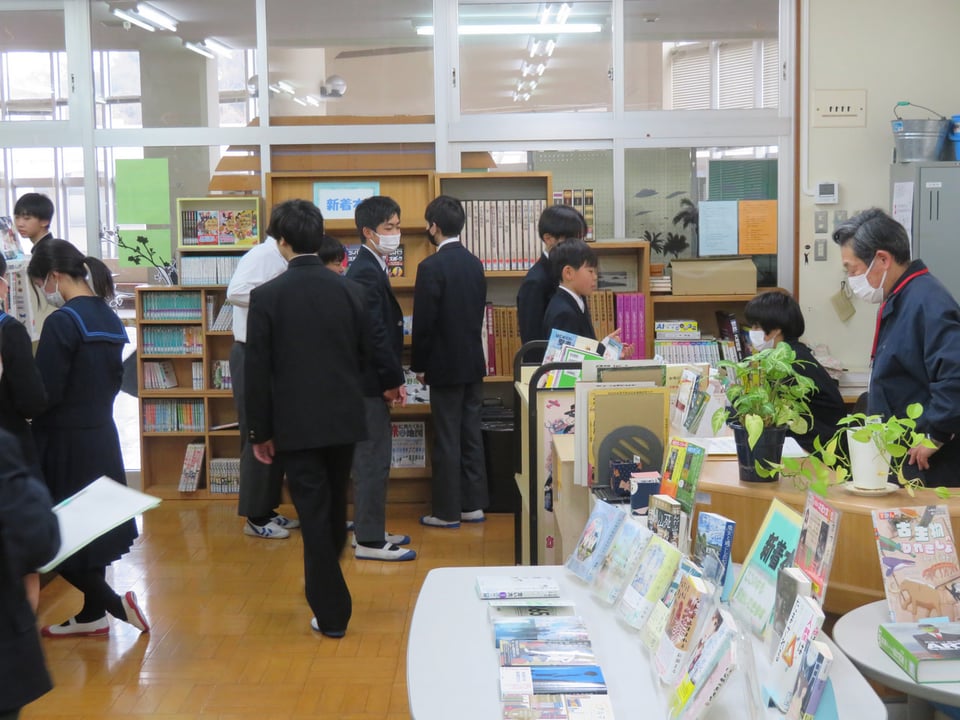 昼休みの図書室の様子です。専門委員会の打合せをしたり、学年末テストに向けて勉強をしたり、本を借りたりしていました。私自身は、中学時代ほとんど本を読まない生徒でしたから、もし中学時代に戻れるなら、たくさん本を読みたいです。学校司書の先生からは、新刊もたくさん入っているので、手に取ってほしいというメッセージを預かりましたよ。