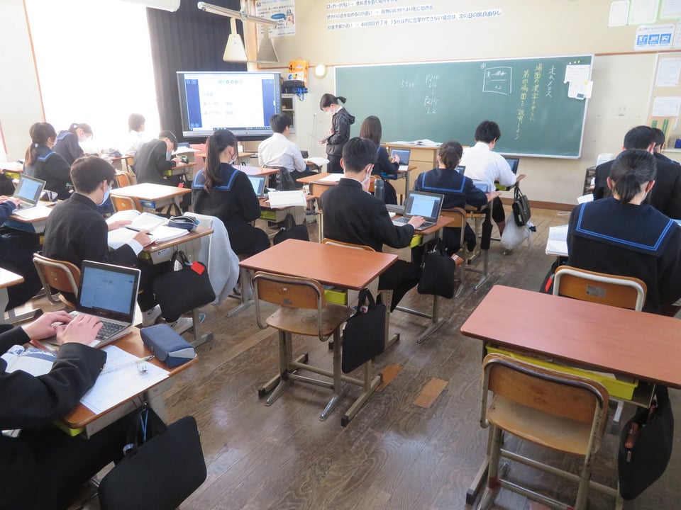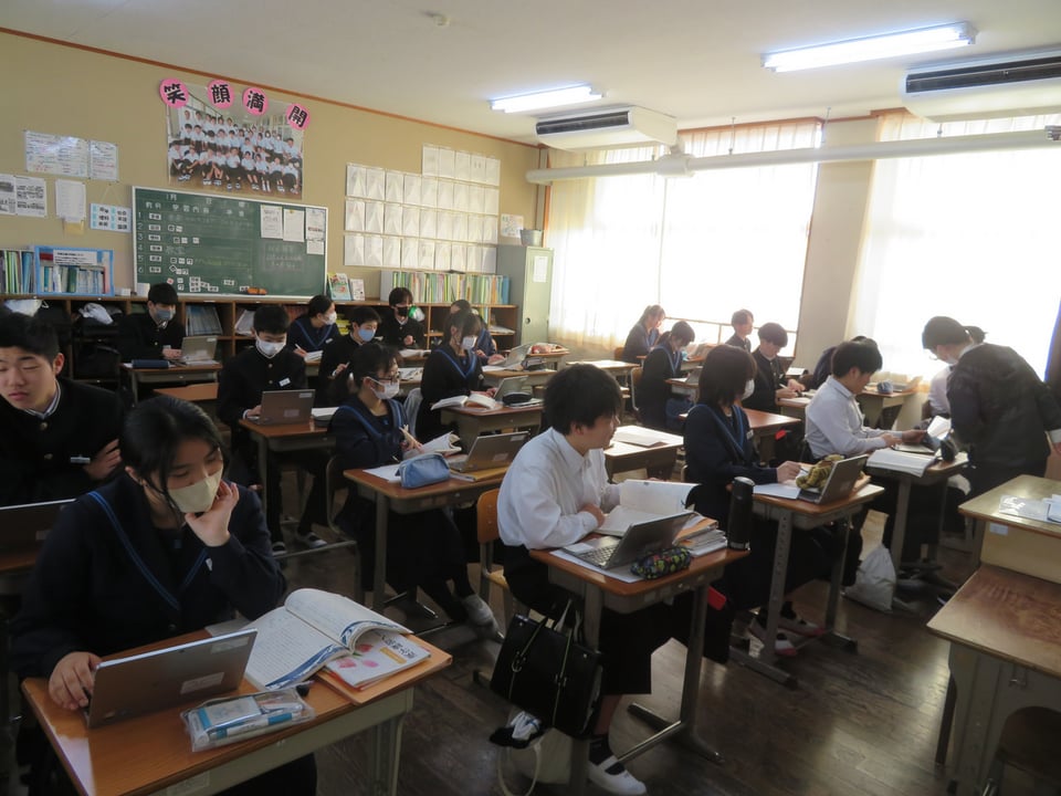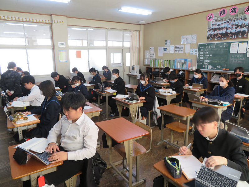 2年2組の国語の授業の様子です。空き机が多くなっています。実は、インフルエンザや風邪症状で本日8名の生徒が欠席しています。今週の木曜に予定していた習熟テストについては、2年生は、1週間延期し12日(木)にします。(1年生は予定通りです。)これ以上感染が広がらないことを祈るばかりです。
