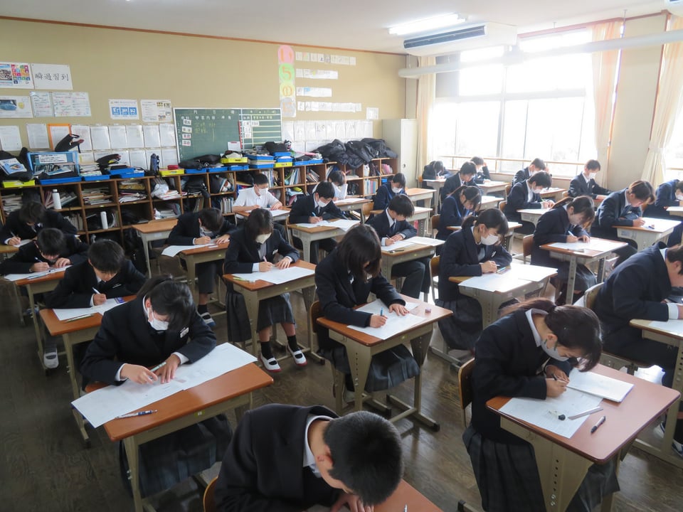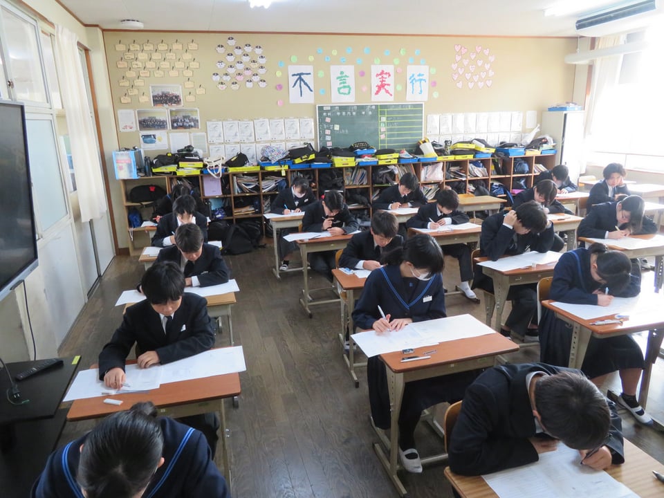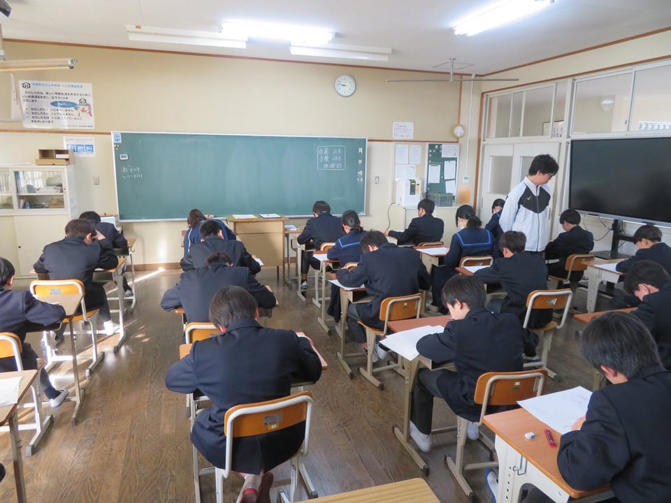 今年度最後の定期テストが実施されています。写真は1年生の1時間目の理科のテストの様子です。前にも書きましたが、1年生、テストの受け方に慣れており、この様子からも4月に比べて、随分成長したなぁ~と感じています。1・2年生の皆さん、火曜日のテストに向けてもうひと踏ん張りです。実は、中3の受験生は、みなさんよりもっともっと努力していますよ。