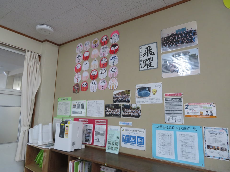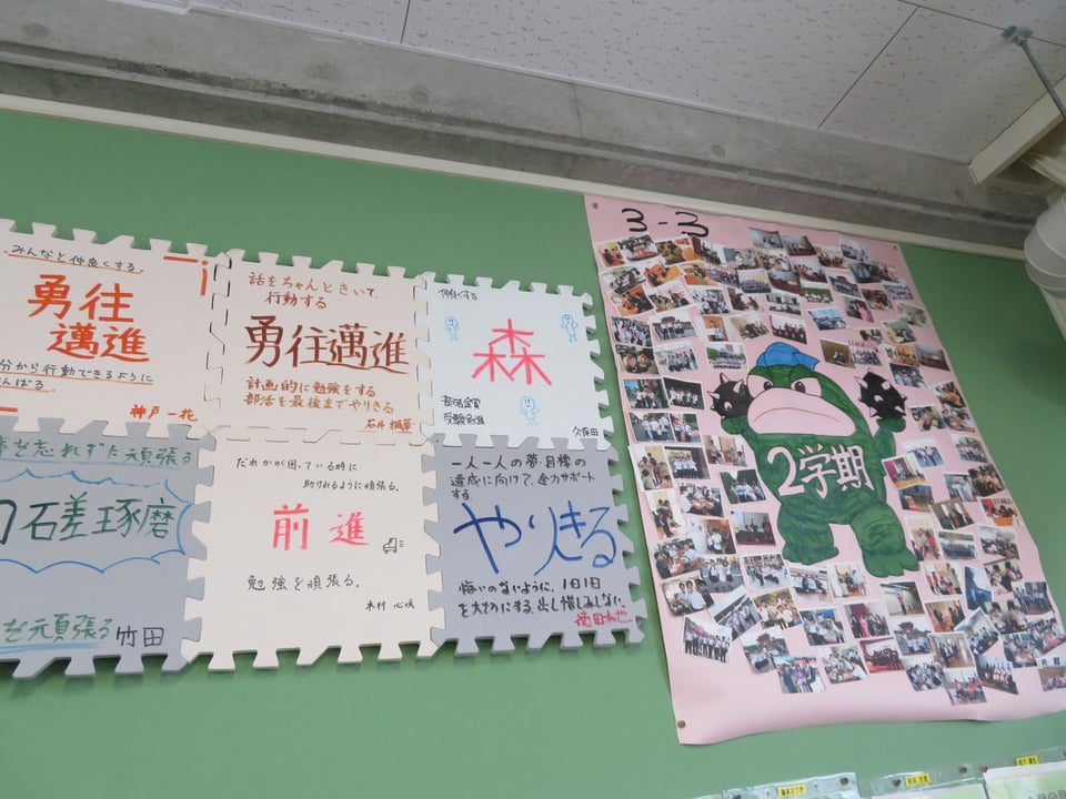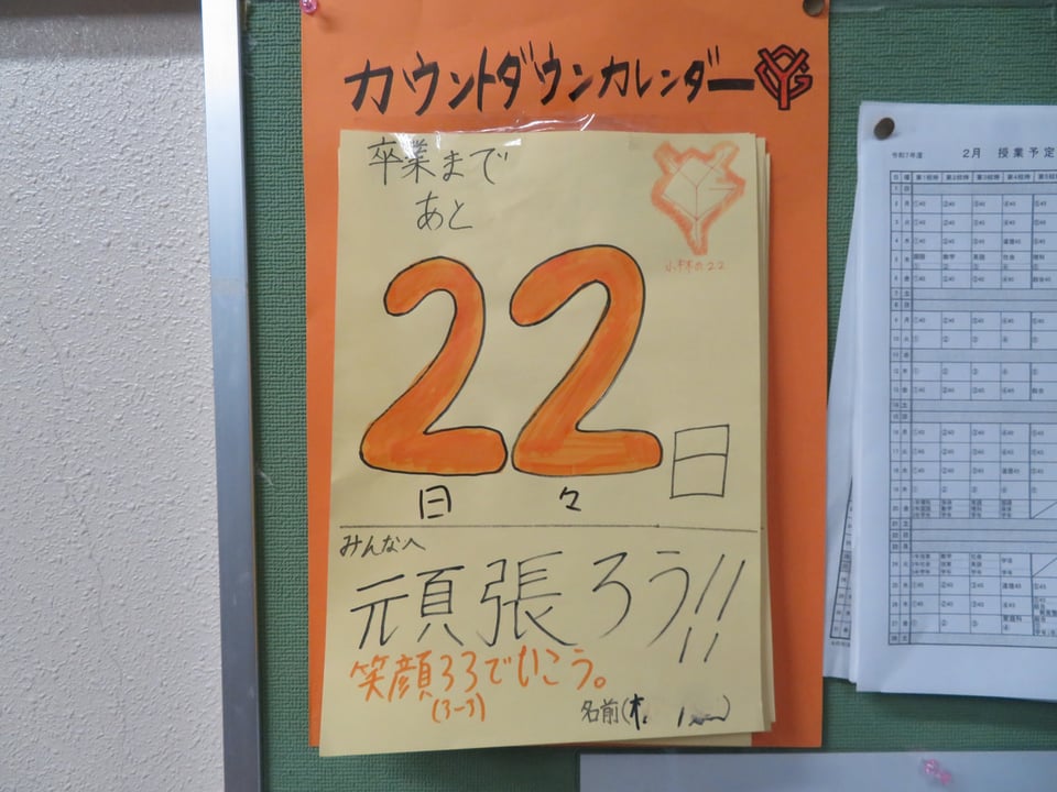 3年生の教室の掲示物です。この時期になると、各学級で卒業式カウントダウン表や合格を祈願した掲示物が作成されます。日が進むのは本当に早く、3年生の登校日数も明日から卒業式まで18日です。ただ、その前に3月5日(木)の公立入試があります。進路が決まった人いますが、3年生75名みんなで引き続き受験に向けて頑張っていきましょう。一致団結!3年生!!