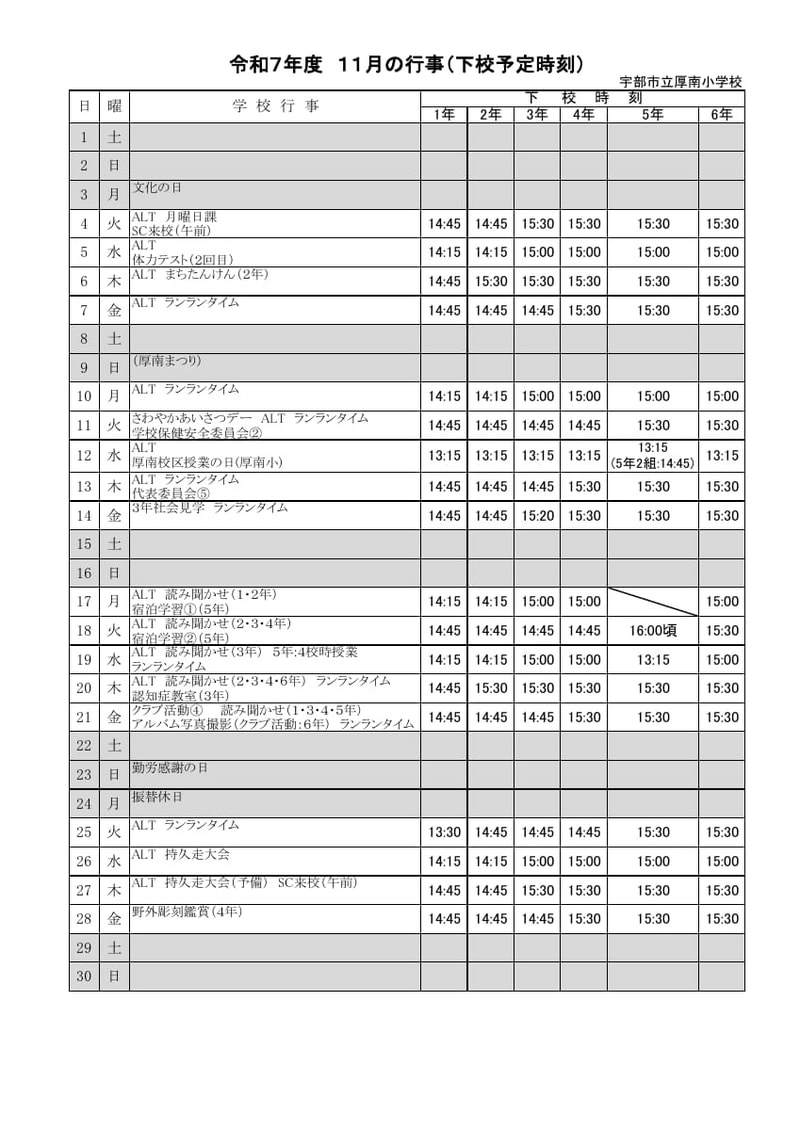 令和7年度 11月の行事予定(下校時刻)(113KB)