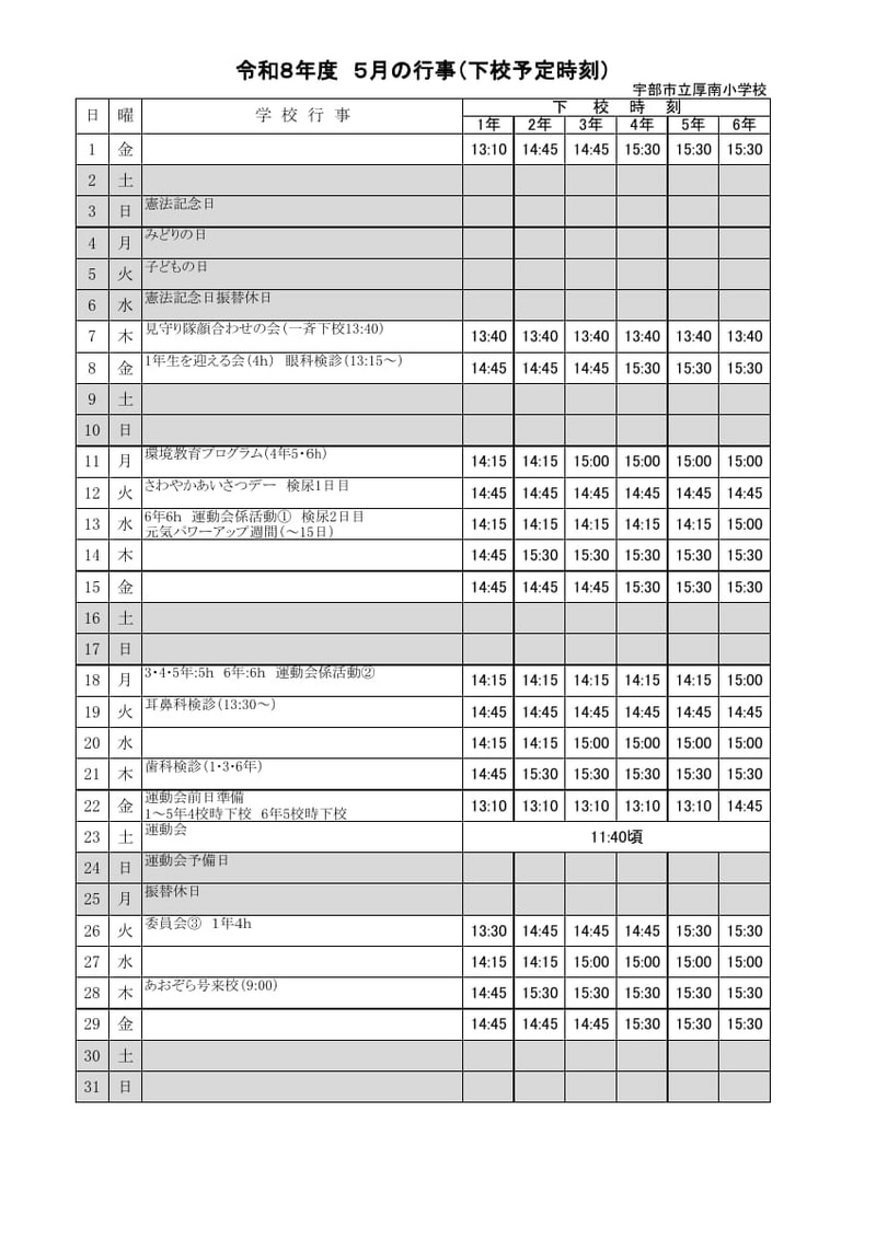 令和8年度 5月の行事予定(下校時刻)(105KB)