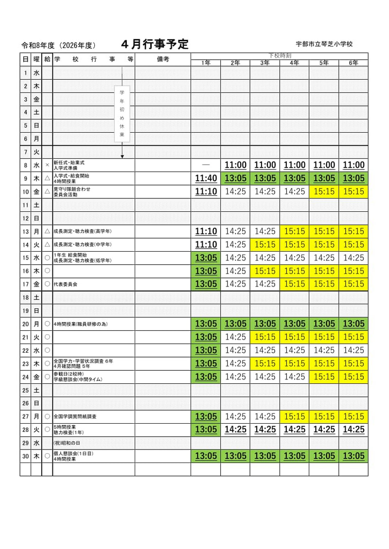 > 4月行事予定・下校時間