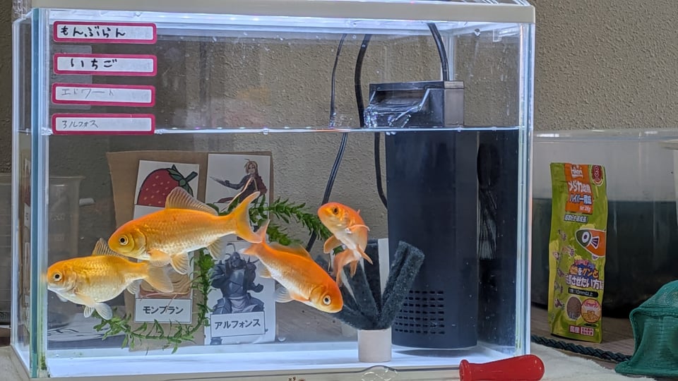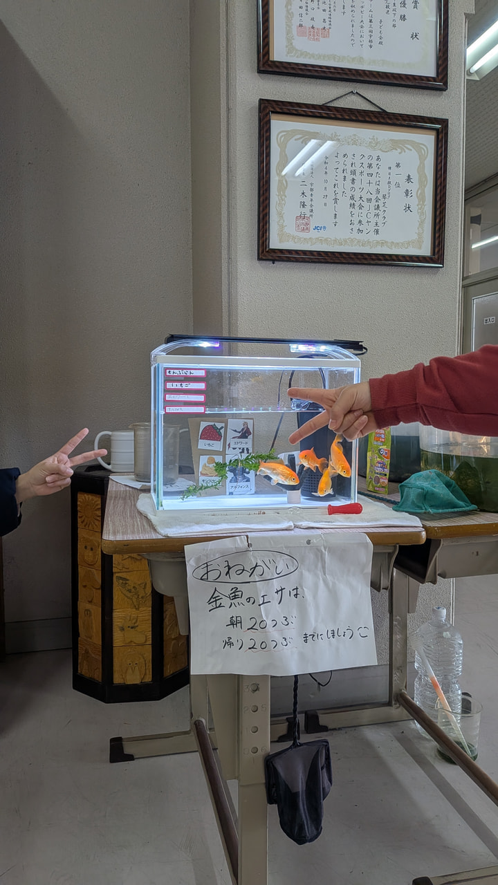 2月4日(水)正面玄関で飼っている金魚に名前が付きました。ご来校の際には、水槽に名前が貼ってありますので、ぜひ愛でてあげてください。