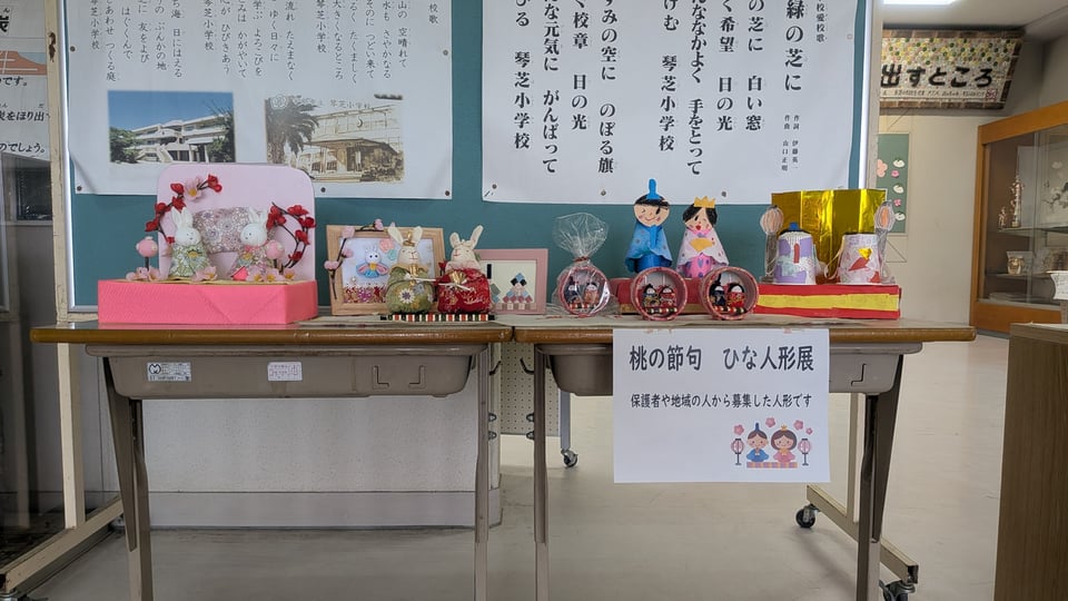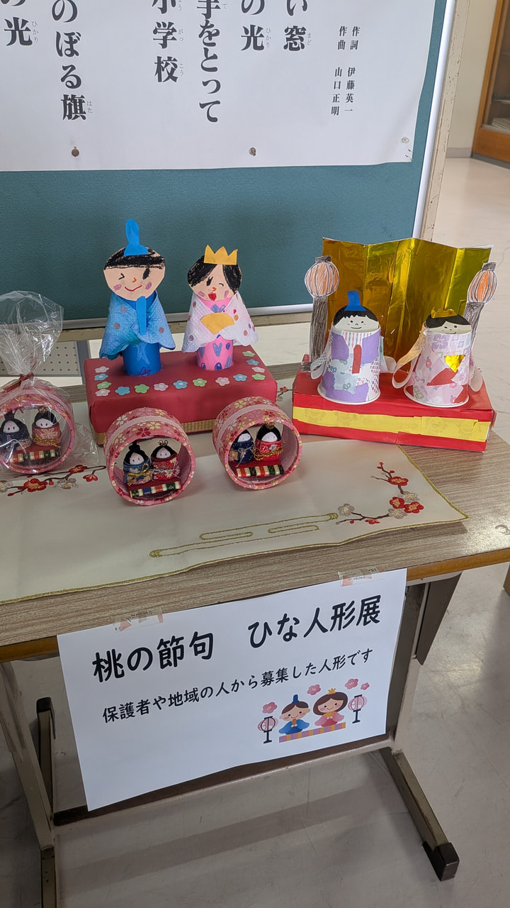 地域や保護者の方への呼びかけを行い、ひな壇が完成しました。1年生の児童も飛び込み参加でかわいいひな壇ができました!正面玄関に飾ってありますので、ぜひご覧んになってください。