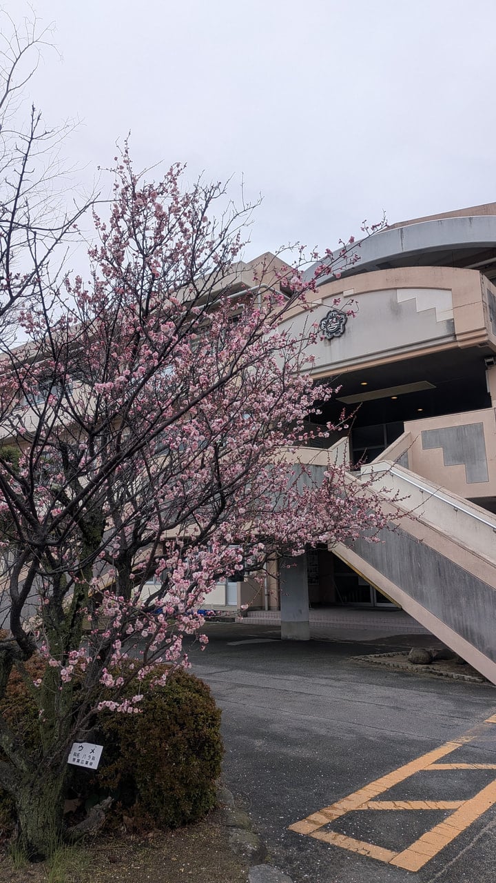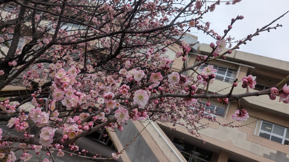 梅の花が児童用昇降口まえの植え込みに咲いています。梅が咲けば、卒業シーズンです。