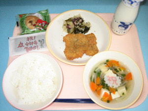 私たちが住んでいる宇部市は1921年11月1日に誕生し、11月1 日で100歳になります。そこで、10月29日に、一足早く、100周年を 記念して、お祝い給食を提供します。宇部市でとれた農水産物をたっぷりと使った給食です。宇部市を築いた先人たちに感謝し、ふるさとの 味を感じながらお祝いしましょう。宇部市では海苔の 養殖もさかんに行 われ、山口県トップの生産量です。 チョーコくんのイラストの入った海 苔です。この他、 お祝い汁やデザートのパイまんじゅうもあります。はもやたこは、宇部市で 水揚げされたものを使用 します。宇部市のはもの水揚げ量は多く、全国有 数の漁獲量です。また、たこもたくさん獲れま す。たこつぼ漁というやり方でたこをとっていま す。