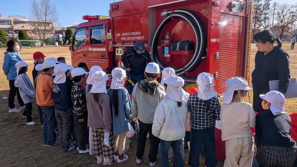12月12日(金)全校で火災想定の避難訓練を行いました。全校が静かにグラウンドに集合した後、1年生が消防車の見学を行いました。【おはしもち(おさない・走らない・しゃべらない・もどらない・近づかない)】というキーワードが大切です。