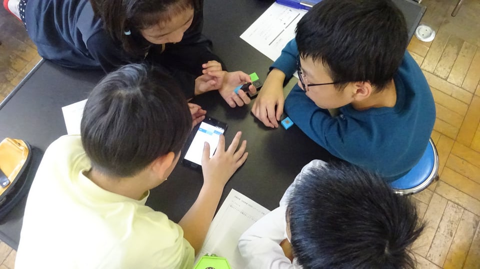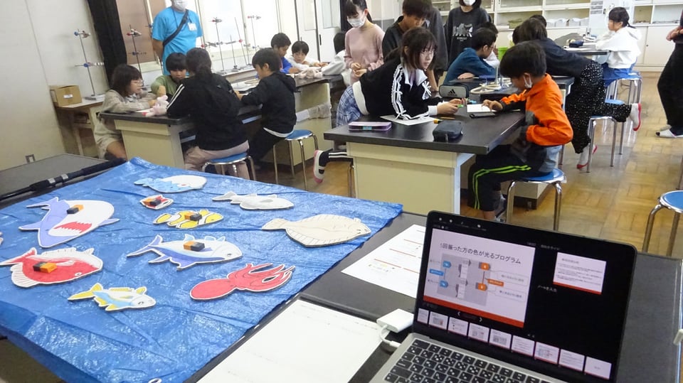 10月23日(木)5,6校時に、理科室で宇部高専の先生と学生さんをお招きして、プログラミング教育を行いました。センサー内臓のアイテムを用いてプログラミングを組み立て、遊びながら学ぶことができました。