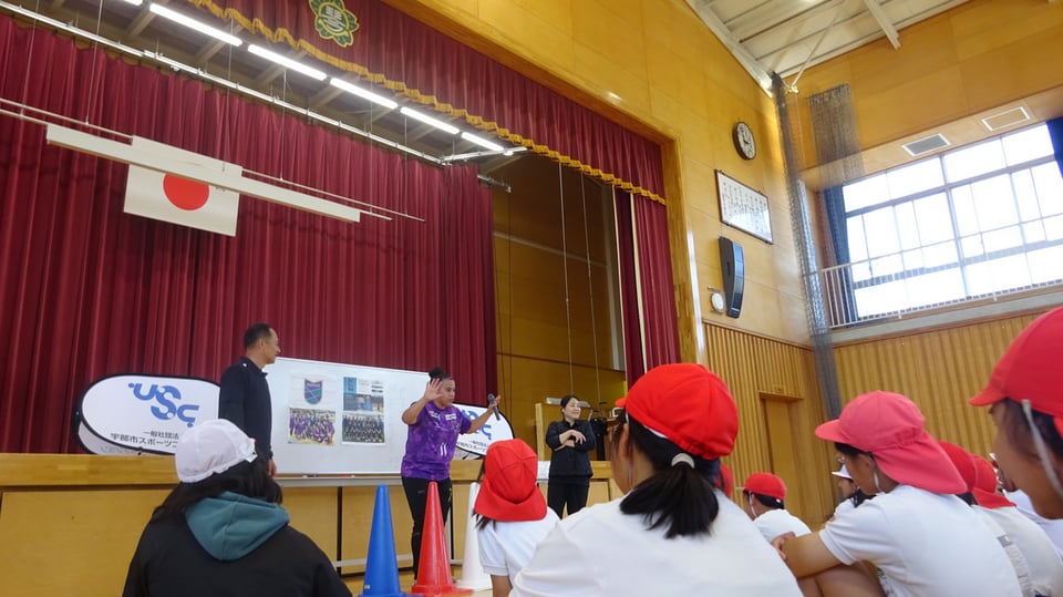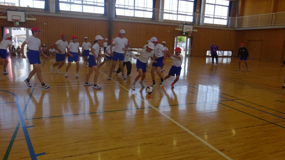 11月10日(月)体育館で、宇部市スポーツコンベンションの主催となる「夢教室」を行いました。宇部市のフットサルチーム「ミネルバ宇部」から選手の方を招き、しっかりと楽しんだ6年生でした。